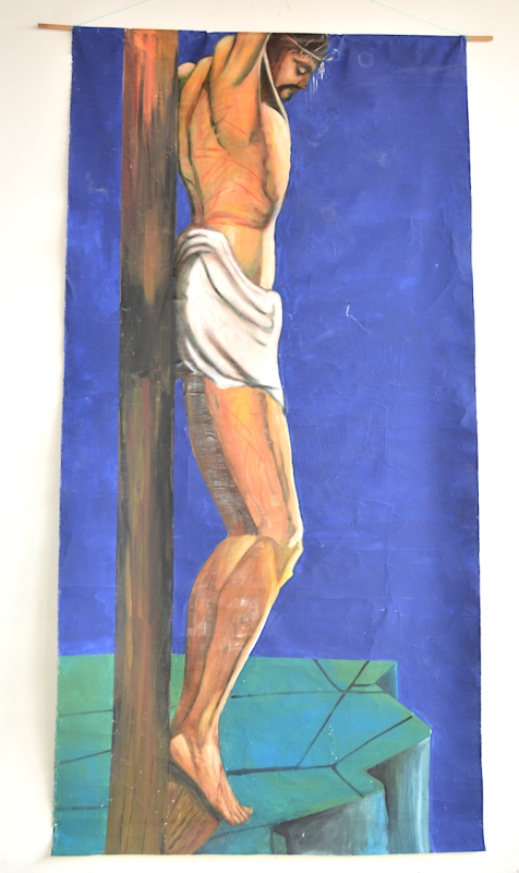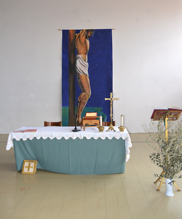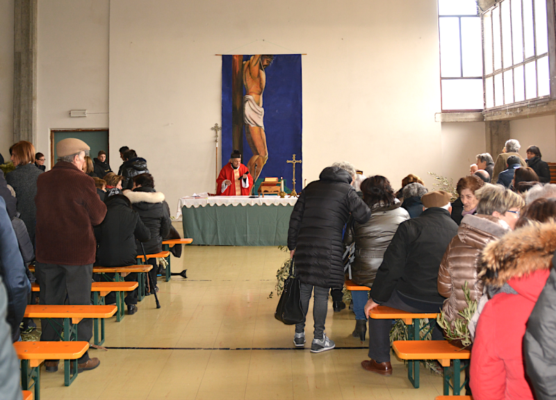 La cerimonia è stata condotta da un brillantissimo Padre Giovanni Guerrino Mazzoni, vice-parroco della Parrocchia di San Michele Arcangelo. Egli ha benedetto gli ulivi, che ogni fedele innalzava verso il cielo, proprio davanti alla Chiesa di San Gregorio Magno. Da qui si è snodata una processione che ha portato i fedeli all’interno della palestra comunale dove tutto era pronto per quella che sarebbe stata una bellissima cerimonia sottolineata dai canti della Corale Petrocchini! Dietro all’altare spiccava un bellissimo acquerello su tela: “Gesù Cristo in Croce”! Opera dell’artista, padre Salvatoriano, Colombiano Juan Josè Carasquilla, è stata recentemente donata alla Parrocchia!