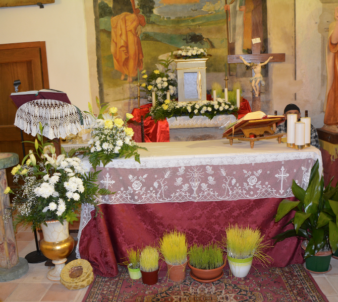 L’Altare Centrale, con ai suoi piedi quei grani azimi consegnati alcune domeniche fa e ora sbocciati in variopinte piantine, ha fatto la funzione di Altare della Reposizione!