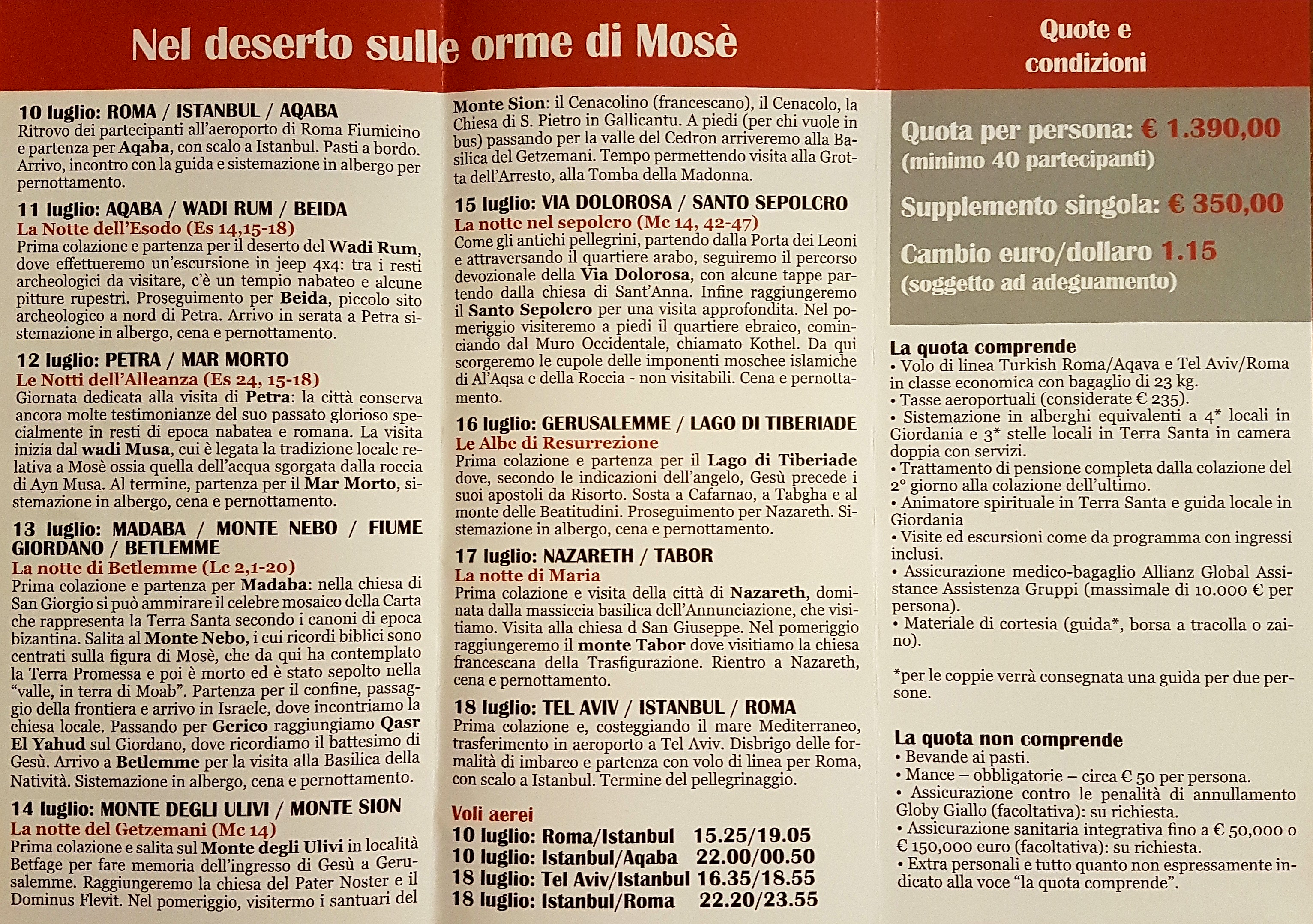 DIOCESI – “Quest’anno il nostro pellegrinaggio diocesano avrà come meta la Terra Santa: quella terra promessa che diede i natali al Figlio di Dio fattosi uomo per noi. L’itinerario sarà speciale perché faremo il percorso che il popolo di Israele per entrare in Palestina: dall’attuale Giordania, visitando Petra e il Monte Nebo Da cui Mosè poté vedere la Terra Promessa senza però riuscire ad entrarci, fino a giungere a Gerusalemme nel luogo della crocifissione e della morte di nostro Signore Gesù Cristo”. Con le parole del Vescovo Carlo Bresciani, ricordiamo che venerdì 20 Aprile si chiuderanno le iscrizioni per il pellegrinaggio diocesano in Terra Santa che si terrà dal 10 al 18 luglio.