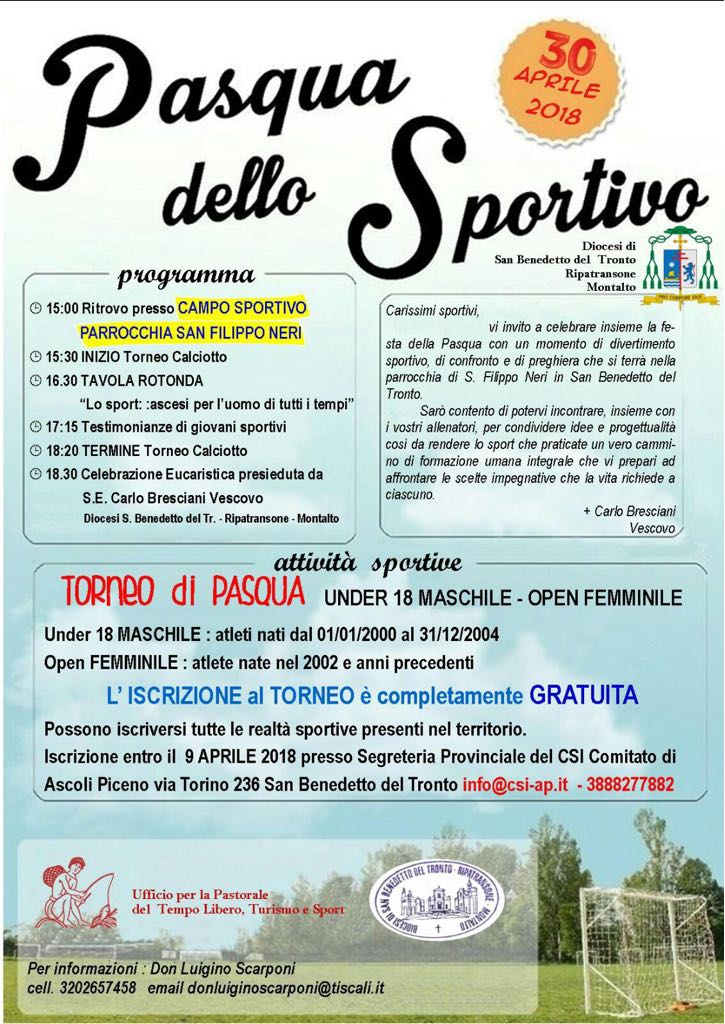 DIOCESI – Proseguono le iniziative del periodo pasquale nella Diocesi di San Benedetto, Ripatransone e Montalto. Il 30 aprile prossimo si svolgerà, infatti, la Pasqua delle Sportivo una giornata di sport, divertimento, riflessione e preghiera.