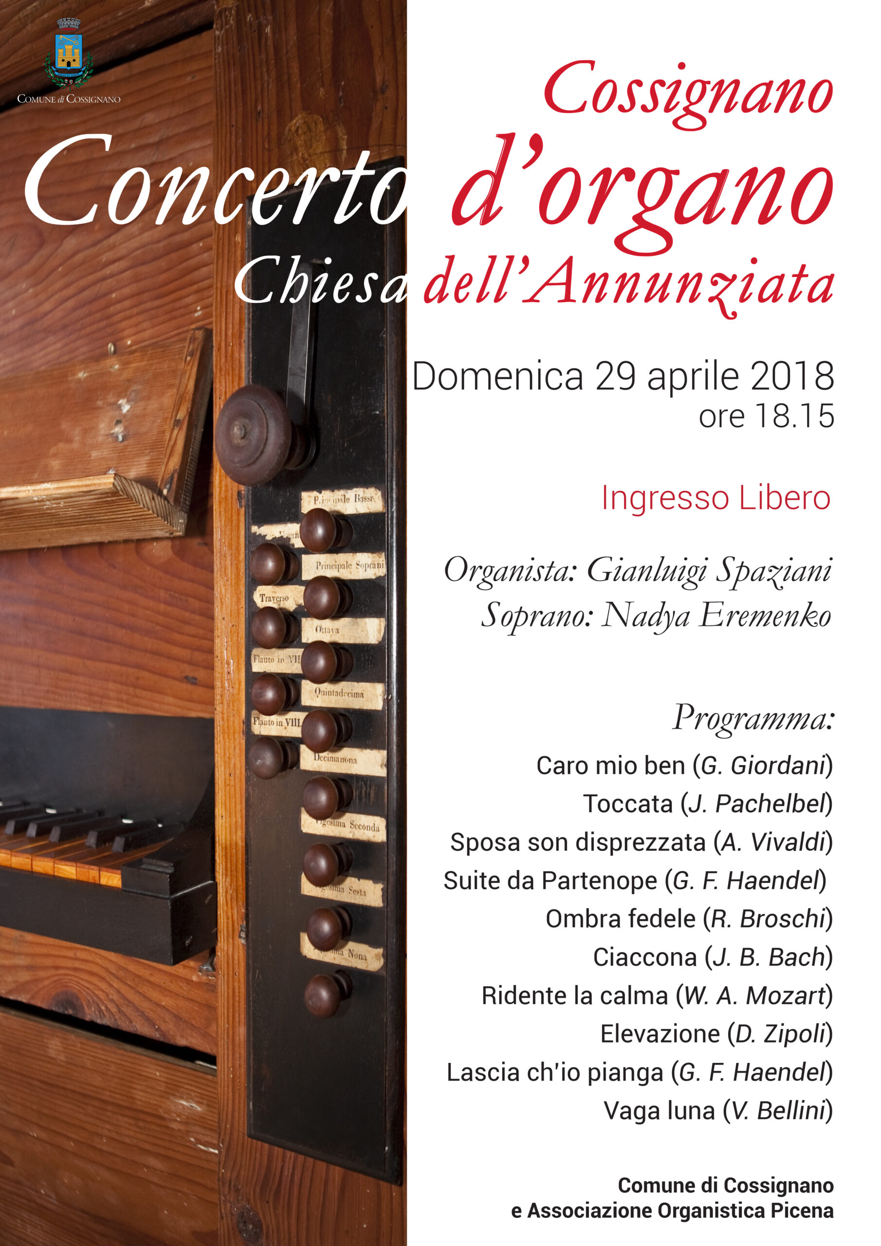 COSSIGNANO – L’Associazione Organistica Picena presenta domenica 29 aprile 2018 alle ore 18.15, nell’ambito delle iniziative promosse dall’Amministrazione comunale di Cossignano per il patrono San Giorgio, il Concerto nella Chiesa dell’Annunziata con l’organo storico Vincenzo Paci del 1856.