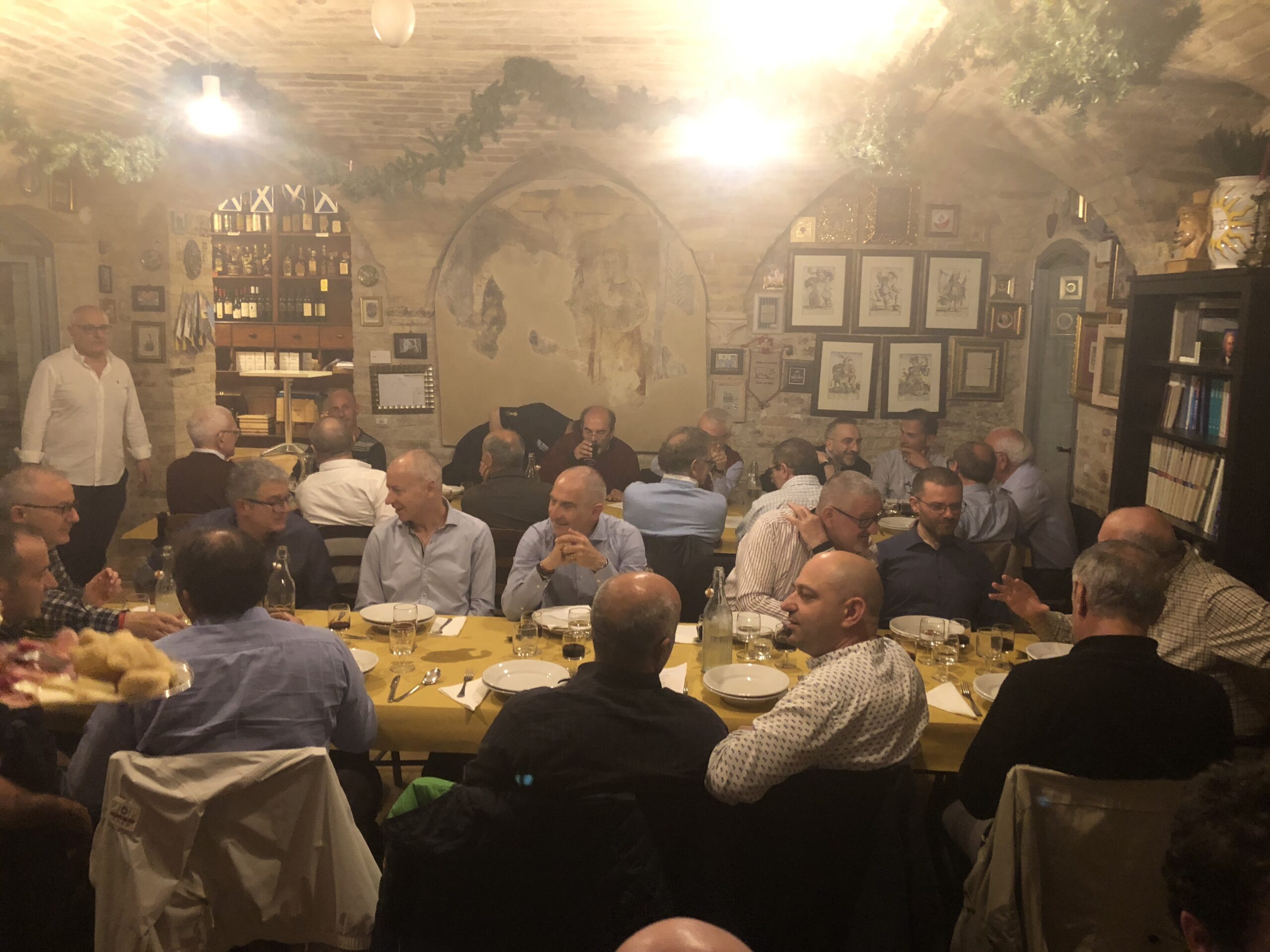 Alcuni soci, sollecitati dal Presidente Max Di Paolo che ha condotto la serata, hanno allietato gli altri commensali con contributi artistici. L’Avv. Andrea Collina si è esibito cantando e suonando il testo La Compagnia della Virtù, da lui appositamente composto per l’occasione. Al termine della cena, grazie al piacevolissimo clima della serata, i soci si sono spostati nel chiostro dove hanno potuto assistere alla consueta performance del Prof Giuseppe, per gli amici Peppe, Fidelibus e ascoltare la splendida armonia della cornamusa, immancabilmente suonata da don Giorgio. Per sgrassare, l’allegra cena è terminata con gli spaghetti aglio, olio e peperoncino. Prossimo appuntamento a gennaio per gli “Esercizi di Cristianità”