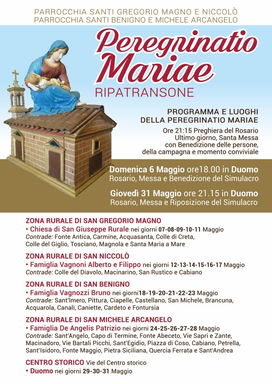 La “Peregrinatio Mariae” è una delle manifestazioni del ricchissimo tesoro della “pietà popolare” le cui profonde radici affondano nella storia delle nostre comunità locali. Nel mese a Lei dedicato, Maria si fa pellegrina nelle famiglie della comunità cristiana di Ripatransone per iniziativa delle confraternite maschili e femminili e di don Nicola Spinozzi, parroco presso la Chiesa di SS. Gregorio Magno e Niccolò e SS. Benigno e Michele Arcangelo.