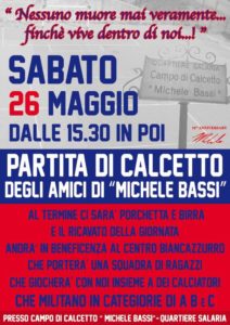 Sabato 26 maggio,dalle 14 e 30 presso il campo del quartiere Salaria intitolato proprio a Bassi, prenderà invece il via una partita di calcetto alla quale sono invitati “gli amici di Michele Bassi” ed . In campo scenderanno anche i ragazzi del Biancazzurro che si uniranno con i giovani presenti ed calciatori di serie A, B, e C invitati a partecipare all’iniziativa. Tra gli altri Luca Cigarini e Michele Canini, ex rossoblù e storici amici della famiglia di Michele. Al termine della manifestazione sportiva si aprirà lo stand conviviale. Il ricavata sarà interamente devoluto in beneficienza al centro “Biancazzurro”.