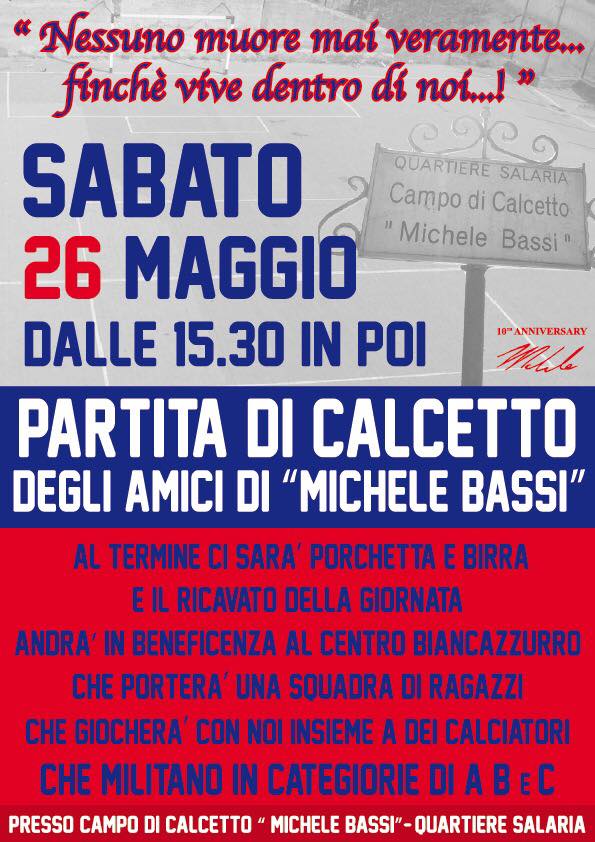Sabato 26 maggio,dalle 14 e 30 presso il campo del quartiere Salaria intitolato proprio a Bassi, prenderà invece il via una partita di calcetto alla quale sono invitati “gli amici di Michele Bassi” ed . In campo scenderanno anche i ragazzi del Biancazzurro che si uniranno con i giovani presenti ed calciatori di serie A, B, e C invitati a partecipare all’iniziativa. Tra gli altri Luca Cigarini e Michele Canini, ex rossoblù e storici amici della famiglia di Michele. Al termine della manifestazione sportiva si aprirà lo stand conviviale. Il ricavata sarà interamente devoluto in beneficienza al centro “Biancazzurro”.
