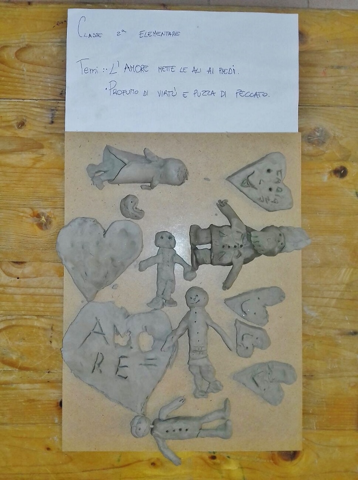 Ciascun gruppo delle elementari aveva scelto una storia a cui dare forma con l’aiuto dei ragazzi più grandi, sotto la supervisione di catechisti, capi-scout e animatori dell’oratorio. Noi educatori avevamo organizzato l’evento e predisposto gli spazi: il cortile parrocchiale per le sculture e il campo da calcio per i giochi conclusivi prima della cena insieme.