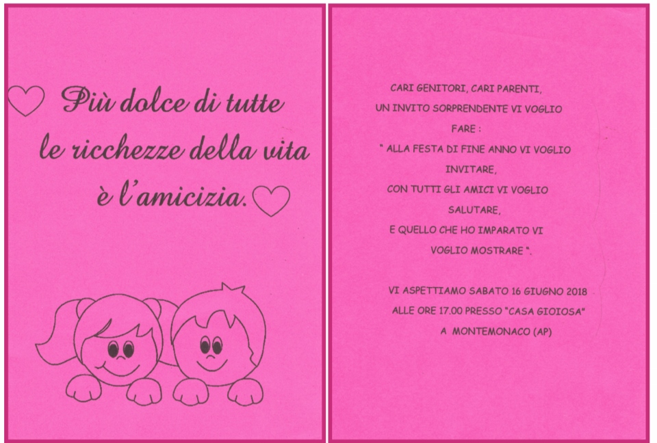 Ha terminato il suo intervento rivolgendo un sentito ringraziamento alle famiglie, al Sindaco di Montelparo, Marino Screpanti, al Sindaco di Montemonaco, Onorato Corbelli, a tutte le maestre, ai collaboratori Franco, Laura, Marina, Francesca e alle cuoche Giovanna e Lulù: tutti insieme hanno saputo portare questo progetto ad un grande successo!