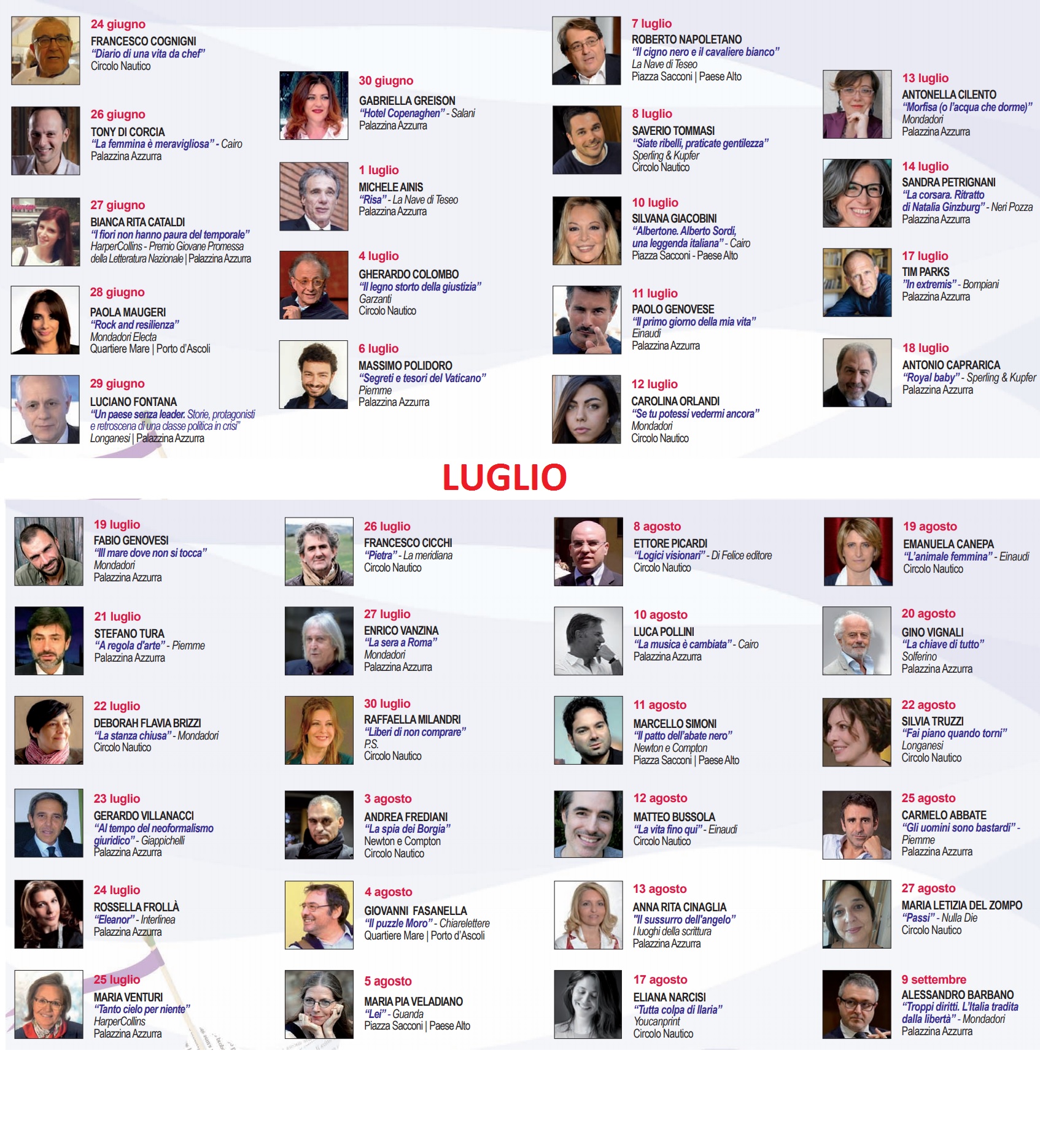 Grazie all’impegno dell’associazione “I Luoghi della Scrittura”, della libreria “La Bibliofila”, del Circolo Nautico Sambenedettese e il contributo e il sostegno dell’Amministrazione Comunale, questa edizione dell’estate 2018 si presenta ai nastri di partenza con più di quaranta autori pronti a discutere con il pubblico delle loro ultime fatiche letterarie.
