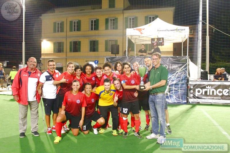 Le indomite ragazze rivierasche sul sintetico di Piazza Pertini in quel di Ancona si sono imposte per 3 reti a 1 contro le quotate avversarie dell’Eta Beta FC, protagoniste assolute nella regolar season e vincitrici della coppa Marche. In un insolito quanto suggestivo palcoscenico, lo Sporting è riuscito così a prendersi una rivincita nei confronti dell’ottima squadra fanese che, nonostante alcune defezioni, è rimasta in partita sino a pochi minuti dal termine in una gara avvincente ed equilibrata. Ad aprire la marcature è stata Maria Francesca Novelli con un gol che consentiva allo Sporting di chiudere la prima frazione in vantaggio, dopo una serie di occasioni sventate da ambo le parti e con i portieri in grande spolvero. Nella ripresa l’Eta Beta provava a pareggiare i conti cercando di aumentare il ritmo del gioco, ma il pivot Chiara Poli si liberava bene e con un bel tiro siglava il raddoppio. La squadra fanese non si arrendeva e a 5’ dal termine sfruttava il quinto di movimento ed accorciava le distanze con bomber Fatica. Nel finale le ragazze di mister Dudu’ difendevano con i denti il vantaggio e proprio allo scadere ancora con un gran bel gol di Chiara Poli mettevano fine alle ostilità e davano inizio alla festa con la conquista di un trofeo che è il giusto coronamento di un’ottima stagione.