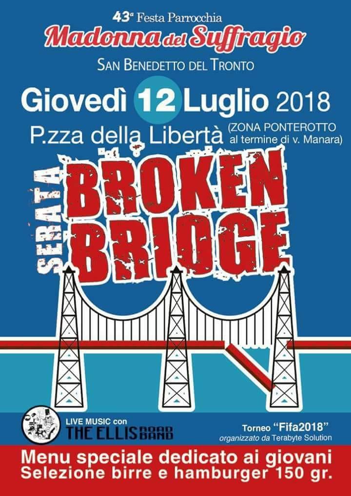 Il programma civile prenderà il via da giovedì 12 Luglio con una novità assoluta: dalle 19.00 si svolgerà il torneo videogioco “Fifa 2018 – Broken Bridge”, organizzato da Terabyte Solution, dedicato in particolar modo ai giovani, ma non solo. Seguirà lo spettacolo musicale della “Ellis Road Band”. Alle 19:30 saranno aperti gli stands gastronomici.
