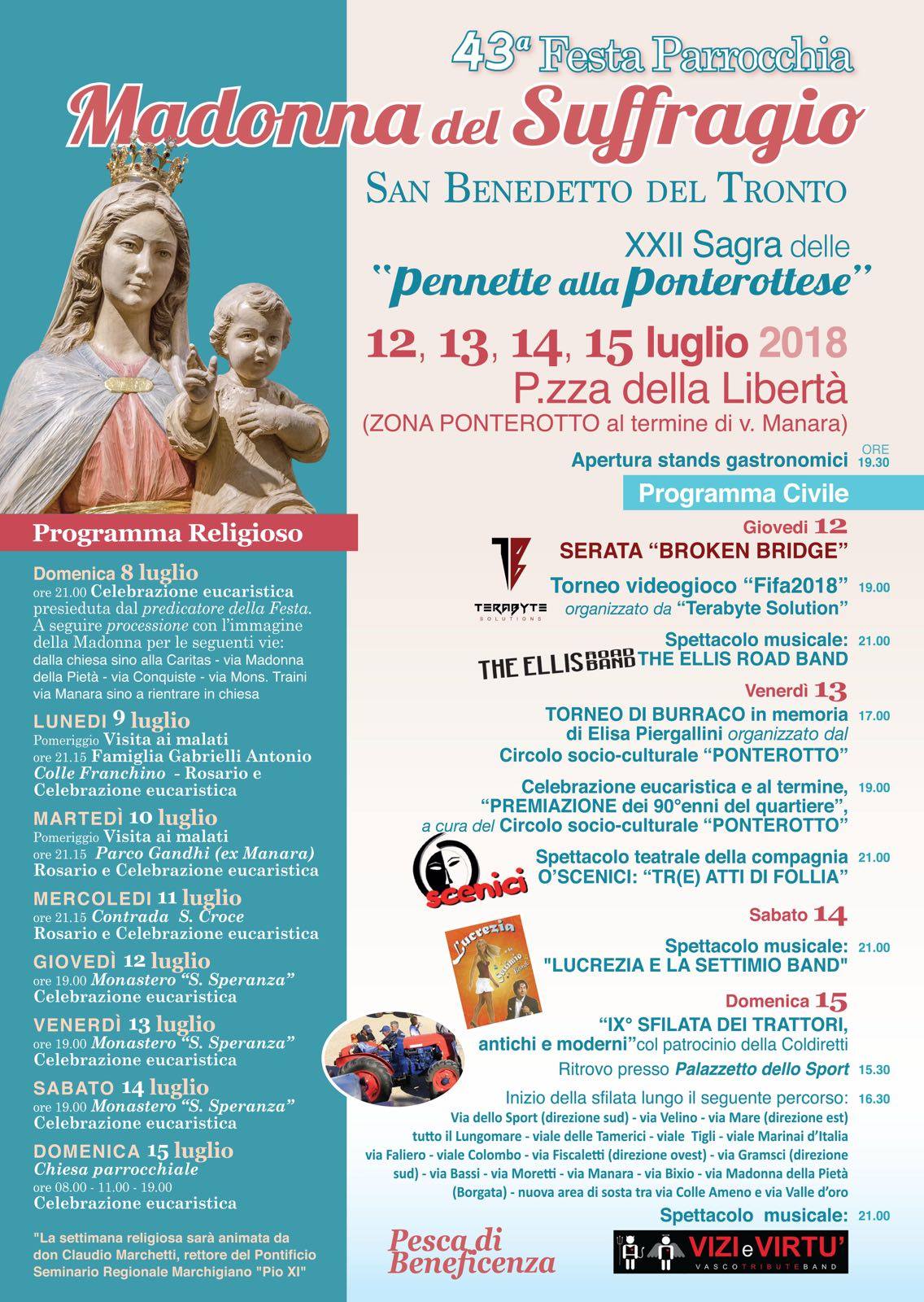 SAN BENEDETTO DEL TRONTO – Come ogni anno, la comunità parrocchiale della zona Ponterotto si appresta a vivere la festa della Madonna del Suffragio, nel solco della tradizione, con alcune novità. La festa parrocchiale, giunta al 43° anno, coincide con la XXII edizione della “Sagra delle Pennette alla Ponterottese” e si svolgerà dal 12 al 15 luglio 2018 presso Piazza della Libertà (zona Ponterotto, al termine di via Manara).