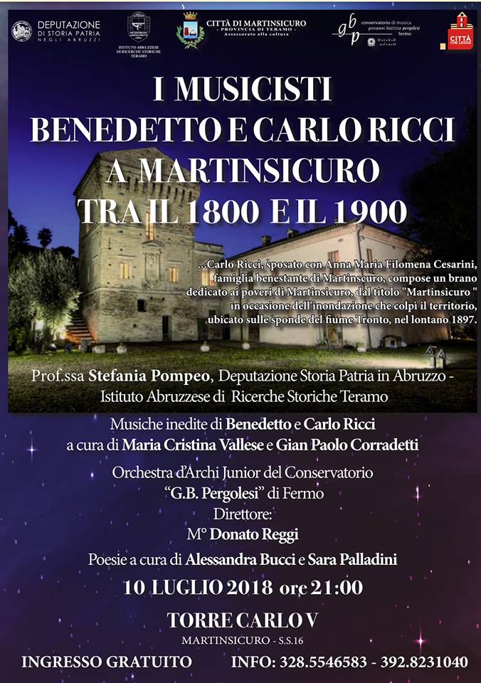 “La Torre Carlo V si conferma scenario ideale per ospitare una serata particolare, inedita, a cavallo tra musica, storia e cultura, alla riscoperta dell’opera inedita di due musicisti molto stimati nella vallata del Tronto come Benedetto e Carlo Ricci che furono legati, a cavallo del secolo scorso, a doppio filo con la nostra Città” dichiarano il Sindaco di Martinsicuro, Massimo Vagnoni, ed il Vice-Sindaco ed Assessore alla Cultura, Pinuccia Camaioni. “La serata sarà poi l’occasione per far conoscere l’inedito dedicato a Martinsicuro da Carlo Ricci, un’occasione più unica che rara per riportare ai giorni nostri una pagina di storia del nostro territorio”.