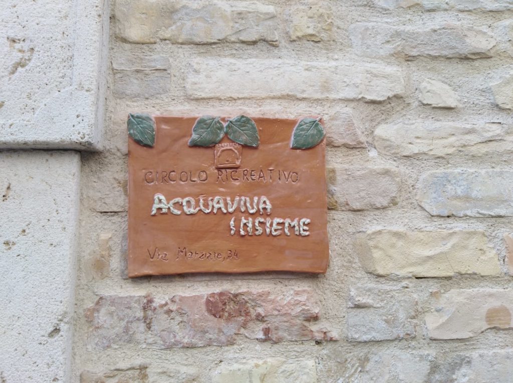 Con il tempo potrebbero esserci nuovi acquisti e come circolo possiamo organizzare eventi di vario genere. Grazie a tutti”. Il sindaco Rosetti ha detto: “È una bella cosa avere un circolo vitale come il vostro ad Acquaviva e soprattutto nel centro storico che anche grazie a voi torna al suo splendore”. Il presidente AUSER della Provincia di Ascoli Piceno Quartarone ha detto: “Quando mi è stata proposta la vostra idea sono venuto di persona a vedere in cosa consisteva, ne sono rimasto contento e mi è piaciuta anche l’idea della scelta del centro storico di Acquaviva. Io sarò disponibile per qualsiasi cosa, la nostra associazione conta molti inscritti e ci fa piacere perché le nostre basi sono aggregazione e solidarietà, noi lavoriamo per dare aiuto e incontrare persone”. È stato ricordato ai presenti che le tessere del circolo Acquaviva insieme e dell’AUSER coprono da infortuni e che gli Statuti rispettano le norme di Legge. La targa fuori dalla porta del circolo Acquavivano è stato realizzato artigianalmente in cotto.