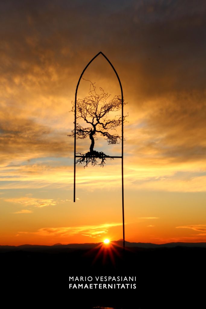 Vespasiani evoca quei racconti ancestrali dove si narra che prima che l’uomo facesse la sua comparsa, sulla terra vi era un albero gigantesco che si innalzava fino al cielo e quale asse dell’universo, attraversava i tre mondi affondando le sue radici negli abissi e coi suoi rami raggiungeva l’Empireo. Attraverso l’albero, il fuoco scendeva dal cielo, la sua cima, raccogliendo le nuvole, faceva cadere le piogge fecondatrici e con la sua verticalità, assicurava il nesso con l’universo. L’albero cosmico è presente in tutte le grandi civiltà fino ad assumere col cristianesimo una valenza salvifica. Fondamento dei miti, ancor oggi molti popoli primitivi come gli indios amazzonici, ritengono che i grandi alberi della foresta tropicale pluviale sostengano la volta celeste e che il cielo crollerà il giorno in cui questi alberi verranno abbattuti. FAMAETERNITATIS è dunque un evento che nasce dalla contemplazione di tali forme, ciascuna con una storia, un mistero, che non smette di interrogarci.