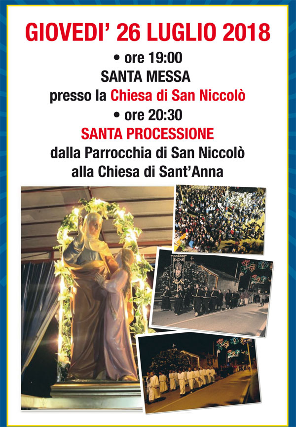 La giornata del 26 luglio sarà dedicata esclusivamente alle celebrazioni religiose. Alle 17, l’antica chiesa ospiterà la Santa Messa per le donne in dolce attesa. Alle 18:30 la statua di Sant’Anna sarà accolta presso la parrocchia San Niccolò di Monteprandone; seguirà la Messa e poi alle 20:30 partirà la Processione solenne dal centro storico verso la chiesa di Sant’Anna, dove alle 22:45 sarà celebrata la S. Messa. Rinfresco per tutti e spettacolo pirotecnico al termine.