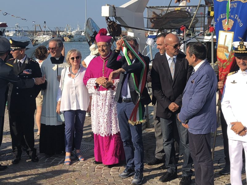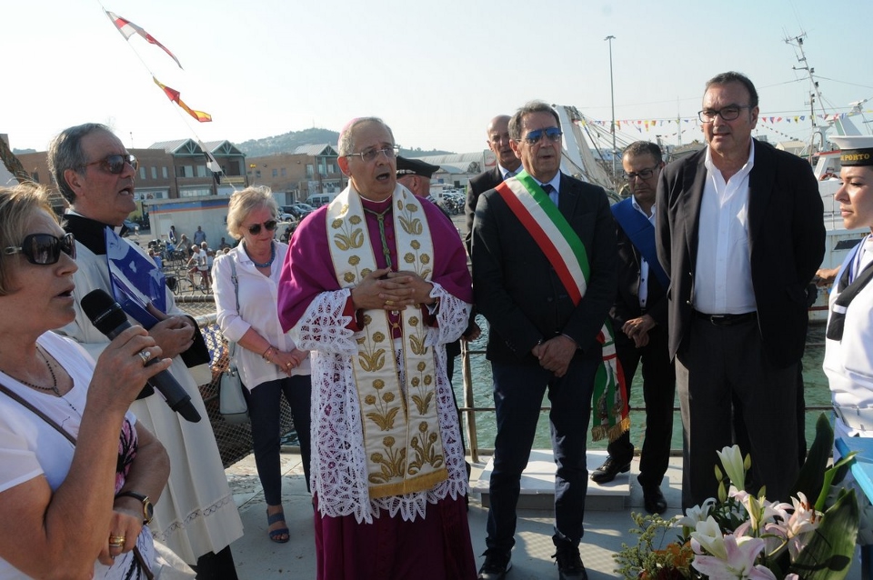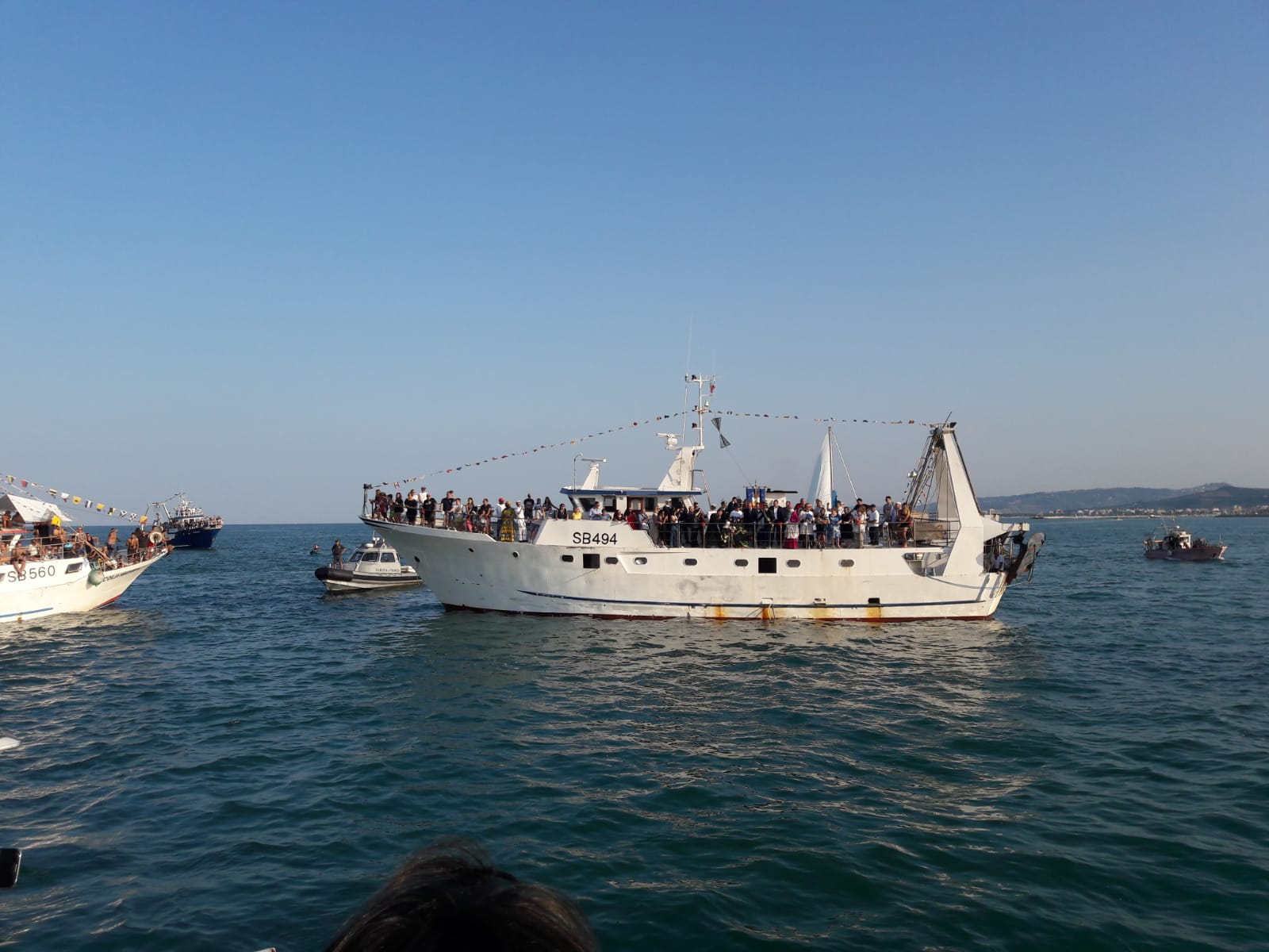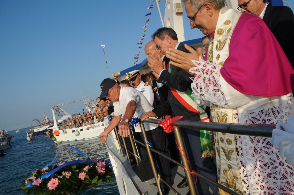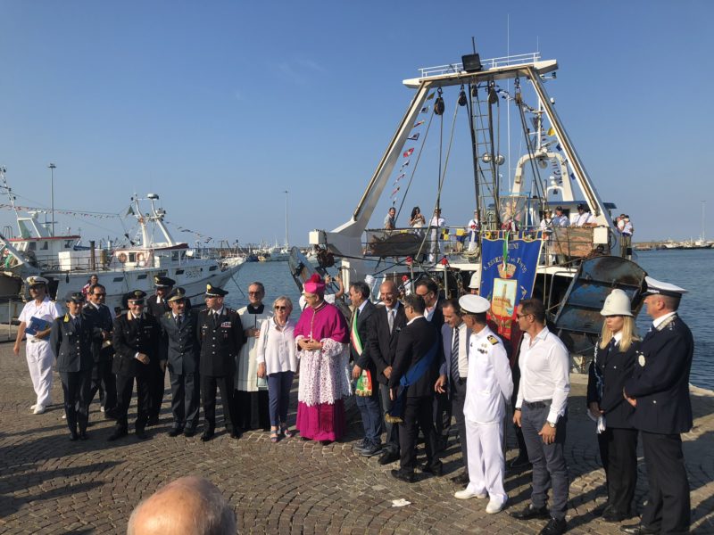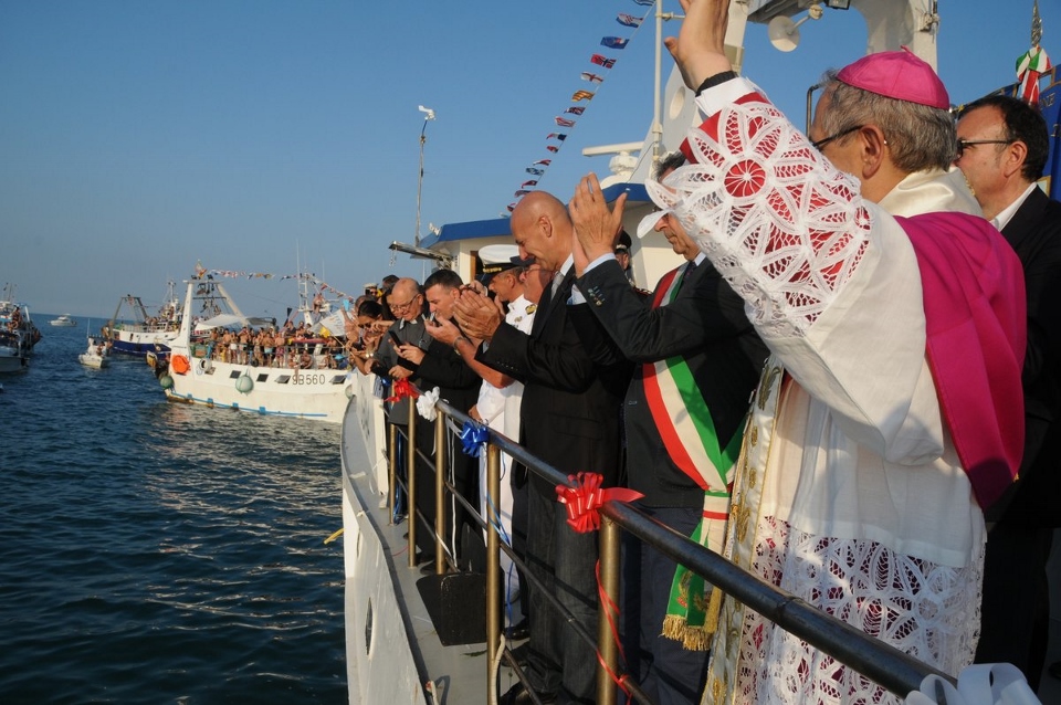 SAN BENEDETTO DEL TRONTO – La festa della Madonna della Marina è giunta a uno dei suoi momenti più suggestivi e significativi: la tradizionale processione in mare con la venerata immagine della Vergine, quest’anno ospitata sull’imbarcazione “Giuliano Carfagna”. Presenti a bordo le autorità religiose, civili e militari della città. Dopo la preghiera recitata dal vescovo Carlo, la “Giuliano Carfagna” è salpata, lasciando il porto accompagnata dallo sguardo dei fedeli e dei turisti assiepati numerosi sulle estremità dei moli e dal fragoroso scoppio dei fuochi d’artificio.