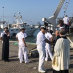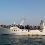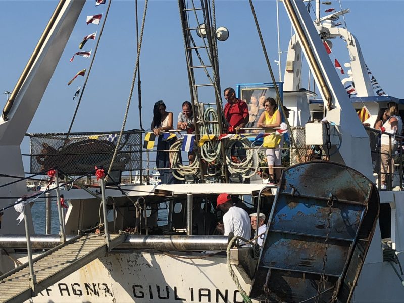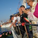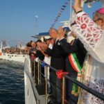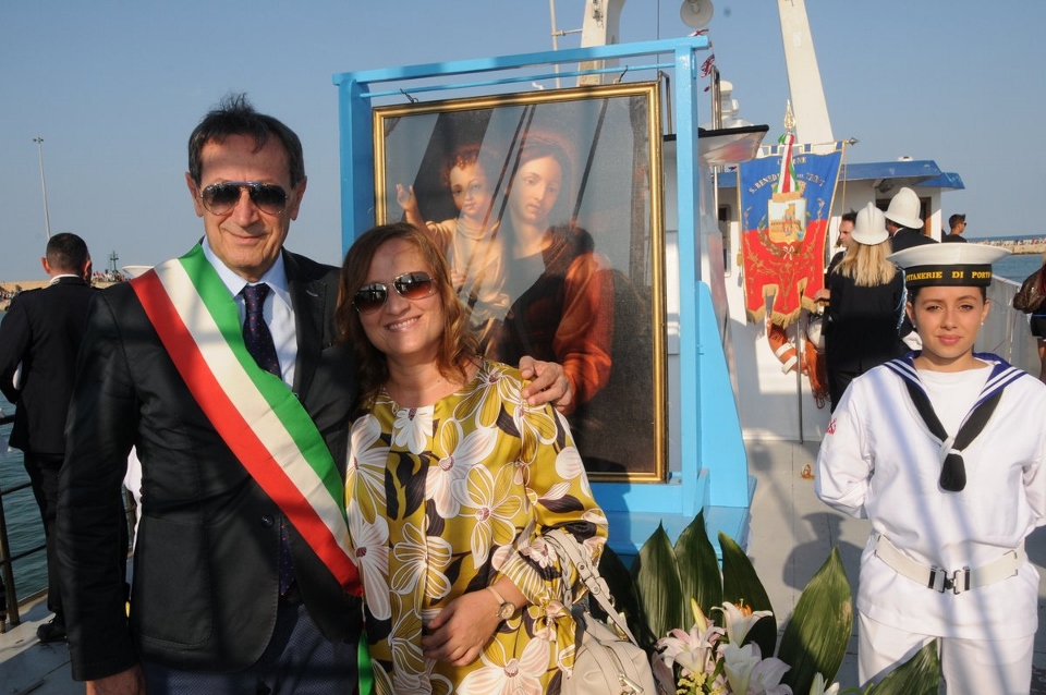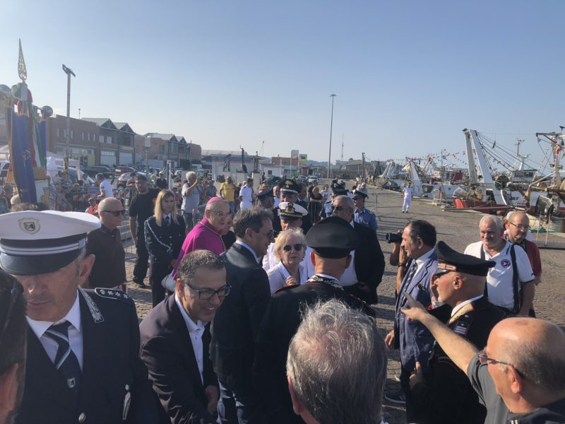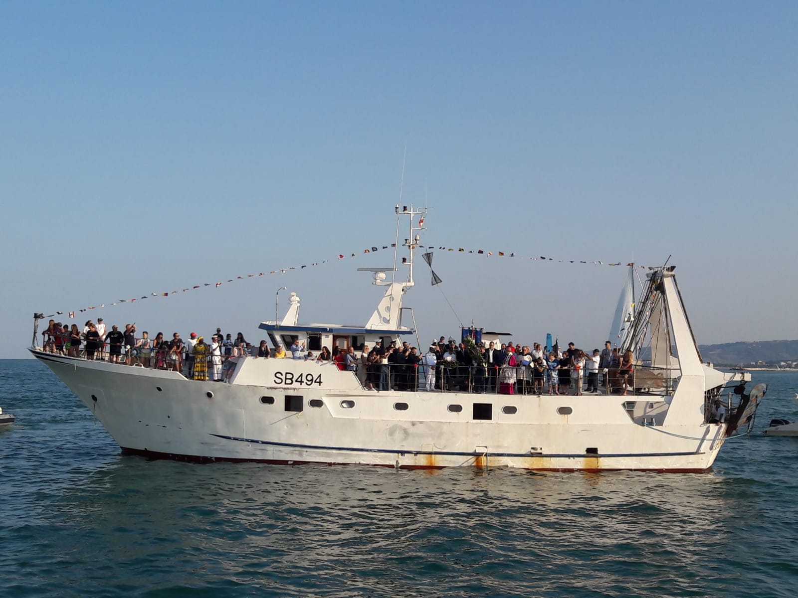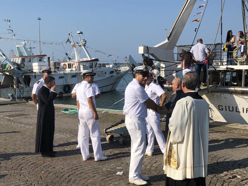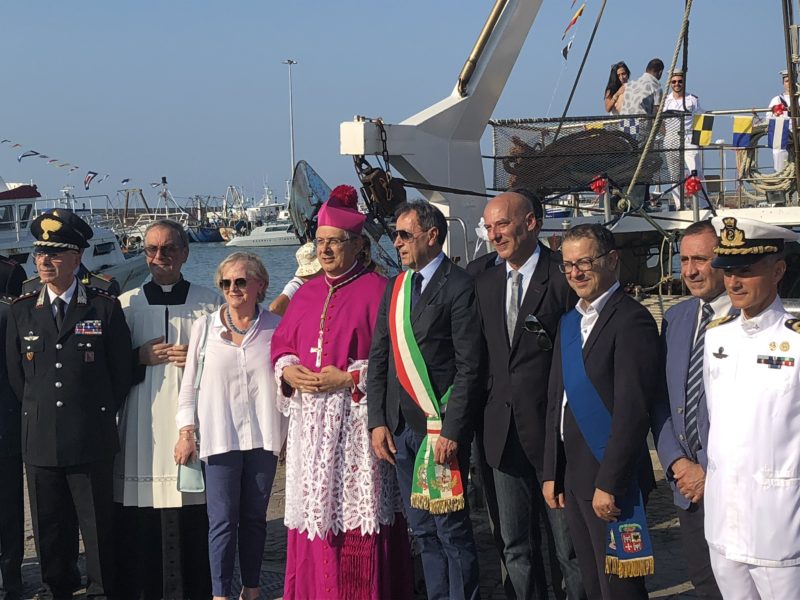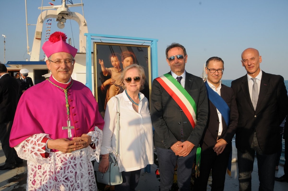 SAN BENEDETTO DEL TRONTO – La festa della Madonna della Marina è giunta a uno dei suoi momenti più suggestivi e significativi: la tradizionale processione in mare con la venerata immagine della Vergine, quest’anno ospitata sull’imbarcazione “Giuliano Carfagna”. Presenti a bordo le autorità religiose, civili e militari della città. Dopo la preghiera recitata dal vescovo Carlo, la “Giuliano Carfagna” è salpata, lasciando il porto accompagnata dallo sguardo dei fedeli e dei turisti assiepati numerosi sulle estremità dei moli e dal fragoroso scoppio dei fuochi d’artificio.