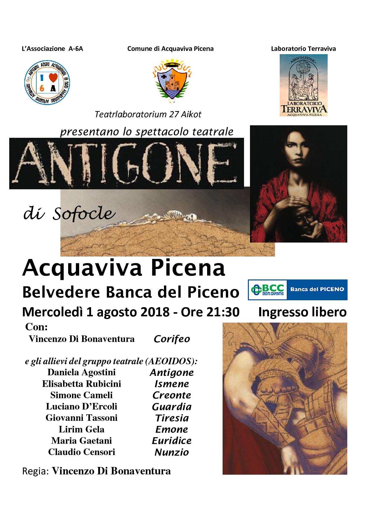 Mercoledì 1 agosto alle ore 21:30 presso la Terrazza della BCC Banca del Piceno verrà rappresentata la tragedia di Sofocle Antigone. L’Associazione A-6A, Laboratorio Terraviva, Teatrlaboratorium 27 Aikot con il patrocinio del comune di Acquaviva Picena e in collaborazione con il maestro Vincenzo Di Bonaventura invitano tutti ad Acquaviva dove si ripete il connubio tra l’estate acquavivana e la riscoperta dei grandi classici del teatro greco, in una versione quanto mai attuale e coinvolgente. Antigone è la tragedia greca che conclude la trilogia tebana di Sofocle: Antigone, figlia di Edipo e testimone di una guerra civile tra i suoi due fratelli, conclusasi con la morte di entrambi, si ribella alla legge del tiranno per dare degne onoranze funebri al corpo di un fratello, destinato altrimenti a rimanere insepolto, in quanto considerato nemico della città. Antigone agisce nel nome della giustizia divina e della dignità umana che deve accompagnare ogni essere vivente, nella vita e nella morte, incarna l’eterno scontro tra la Legge imposta dall’autorità dei sovrani e i Diritti naturali degli uomini in quanto tali.