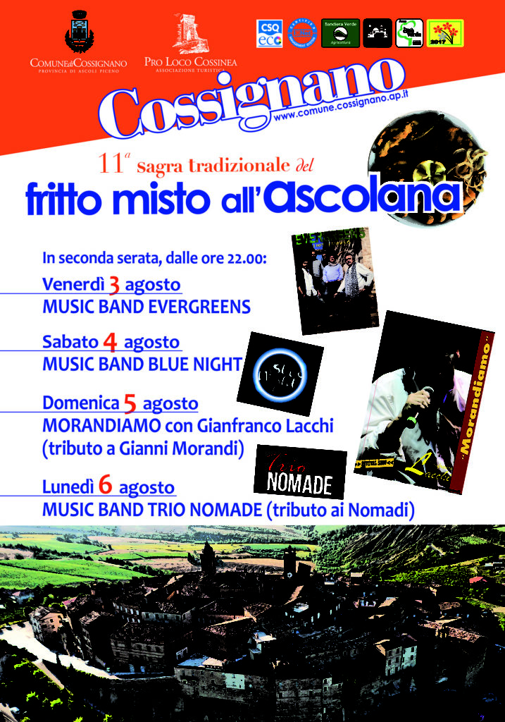 COSSIGNANO – Appuntamento a Cossignano da venerdì 3 a lunedì 6 agosto, dalle ore 19:30 e fino a notte fonda, con la sagra del fritto misto più interessante del Piceno. Curiosi e buongustai potranno lasciarsi conquistare dal miglior fritto misto all’ascolana e le sue varianti, cucinato con gli accorgimenti e l’amore di una volta da mani sapienti della Pro Loco Cossinea. Un piatto genuino che saprà trasformare le tradizionali serate enogastronomiche estive cossignanesi in un vero e proprio ritrovo per intenditori. L’autentica e tradizionale Sagra del “Fritto misto”, giunta alla sua undicesima edizione, prevede un menù capace di deliziare anche il palato dei più esigenti: si può iniziare con le mezze maniche al profumo di bosco e poi fritto misto, dominato dalla rinomata oliva ripiena di carne che accompagna il non meno celebre cremino, tutto proveniente da un laboratorio locale di Cossignano che garantisce tecniche di produzione manuale-artigianale, rispettose delle tradizioni, oltre di genuina e fresca qualità. Il piatto, arricchito anche con anelli di cipolle, funghi, zucchine e tagli di tacchino fritto, quest’anno prevede l’aggiunta di una nuova prelibatezza: il formaggio fritto. Il tutto potrà essere accompagnato da vini di produzione di cantine locali del territorio che coltivano vitigni rigorosamente autoctoni come Pecorino, Passerina e Rosso Piceno, per la produzione di vini DOCG, DOC e IGT. Per i più golosi non mancheranno gustosi biscotti secchi prodotti dai forni del territorio. Una sagra del gusto, di qualità, capace di offrire un fritto “ricco” ma soprattutto ben cucinato e “leggero” e che, come è stato sempre negli auspici dell’Amministrazione comunale e della Direzione della Pro Loco, intende valorizzare in maniera prevalente i prodotti locali e della tradizione, secondo il principio della filiera corta legata al territorio coinvolgendo le migliori aziende agricole e artigianali del luogo. Dunque un’occasione davvero unica di gustare il fritto misto all’insegna della qualità e dei sapori della tradizione apprezzando i migliori vini locali. Per rendere le serate enogastronomiche ancora più speciali, dalle ore 22.00, sono in programma importanti eventi musicali: venerdì 3 agosto EVERGREENS; sabato 5 agosto BLUE NIGHT; domenica 6 agosto MORANDIAMO con Gianfranco Lacchi (tributo a Gianni Morandi) e, infine, lunedì 7 agosto TRIO NOMADE (tributo ai Nomadi). Un’offerta musicale molto importante che si auspica possa essere apprezzata da un pubblico, curioso, vasto e variegato per gusti e fasce d’età. Tutti a Cossignano, terra del gusto e delle emozioni!