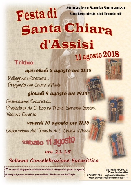 Venerdì 10 agosto alle ore 21.15 si terrà invece la celebrazione del transito di Santa Chiara.