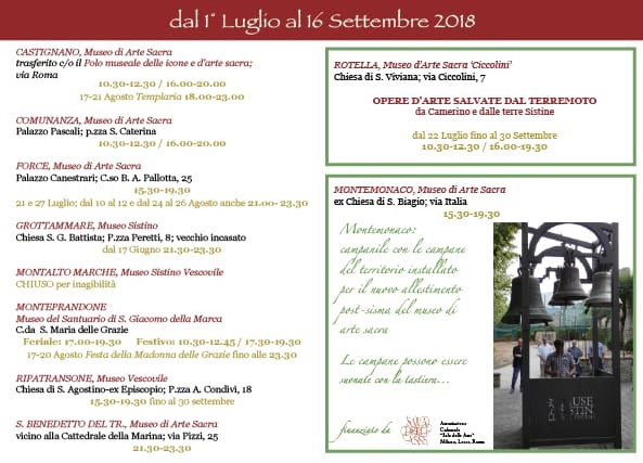 DIOCESI – I Musei Sistini del Piceno sono la rete di musei d’arte sacra della Diocesi di San Benedetto del Tronto-Ripatransone-Montalto, comprendente attualmente dieci sedi espositive distribuite nel territorio ecclesiastico di competenza, le sedi sono: Castignano, Comunanza, Force, Grottammare, Montemonaco, Montalto Marche, Ripatransone, Rotella e San Benedetto del Tronto. L’intera rete è dedicata a Sisto V, al secolo Felice Peretti, papa originario di questa terra alla quale mostrò forte attaccamento anche nel corso del suo breve ma intenso pontificato (1585-1590).