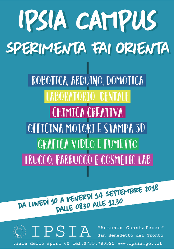 SAN BENEDETTO DEL TRONTO – Aperte fino a martedì 4 settembre le iscrizioni per partecipare al CAMPUS SPERIMENTA FAI ORIENTA, organizzato dall’IPSIA “A. GUASTAFERRO” di San Benedetto del Tronto. Da lunedì 10 a venerdì 14 settembre ragazzi e ragazze potranno cimentarsi con la stampa3d o in un laboratorio dentale, sperimentare trucco e acconciature, grafica e fumetto, giocare con la chimica, la moda, la robotica, i motori e lo sport. Queste e molte altre attività per conoscere e mettersi alla prova, scoprire una professione, fare sport, creare in un fab-lab. Il campus, organizzato dall’IPSIA “A. GUASTAFERRO” di San Benedetto del Tronto e gestito da docenti ed esperti dell’Istituto, accoglierà gratuitamente nella seconda settimana di settembre, ragazze e ragazzi della fascia di età compresa tra i 13 e i 15 anni, alunni delle future terze classi di scuola secondaria di 1° grado e delle future classi prime di scuola superiore. Sul sito della scuola www.ipsia.gov.it tutte le informazioni, il calendario e i moduli per le iscrizioni. Le attività si svolgeranno dalle 8.30 alle 12.30 e ogni mattina sarà divisa in due fasce orarie durante le quali sarà possibile scegliere quali laboratori frequentare. Sarà un modo nuovo per familiarizzare con una scuola superiore, i suoi spazi, i suoi docenti e sperimentare attività innovative, reali e coinvolgenti.