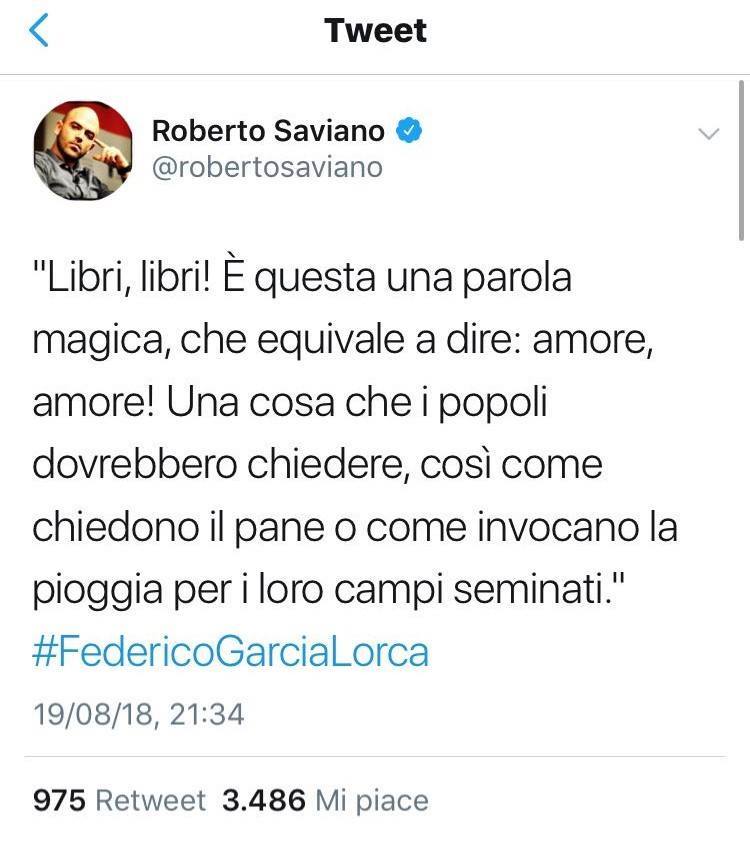 Lo scrittore napolateno, Roberto Saviano, cita in un twitter il Garcia Lorca del poeta marchigiano Lucilio Santoni (E libri e ancora libri, Lindau 2017). Nel post, Saviano sottolinea l’estrema importanza dei libri nella nostra vita.