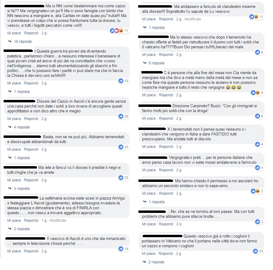 SAN BENEDETTO DEL TRONTO – A margine della presentazione del libro “Coi piedi per terra” di Guido Castelli, avvenuta nella serata di martedì 28 agosto presso la Palazzina Azzurra, abbiamo chiesto all’autore e Sindaco di Ascoli una dichiarazione riguardo le pesanti offese (si veda sotto una raccolta antologica dei peggiori insulti e ci scusiamo con i lettori per le volgarità riportare per dovere di cronaca) che in questi giorni sono state rivolte sui social al vescovo di Ascoli Mons. Giovanni D’Ercole e all’intera diocesi per la scelta di ospitare alcuni immigrati della nave “Diciotti”.