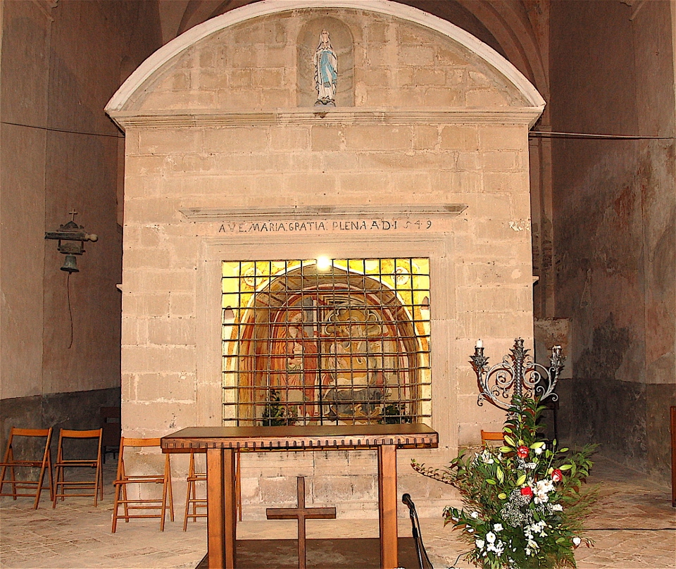 La storia la rappresenta il Santuario stesso di cui si ha notizia fin dal 1259 quando in questo luogo, poco distante dal centro abitato, fu edificata una sontuosa nicchia votiva francescana. La nicchia, recentemente sottoposta a restauro nei suoi incredibili, meravigliosi affreschi, fu poi sormontata da quella grande chiesa, così come si presenta adesso, nel 1549. A quest’epoca risale anche la costruzione di un piccolo convento dei Frati Minori del Terz’ordine Francescano, collegato con la chiesa dalla parte dell’abside, di cui oggi compaiono solo delle tracce.