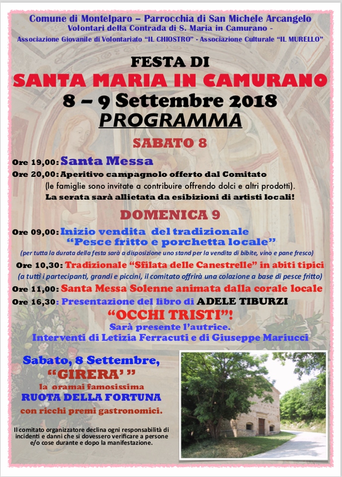 Curata, infatti, dall’archivista parrocchiale Letizia Ferracuti ci sarà la presentazione del libro di Adele Tiburzi “Occhi tristi” con letture di alcuni brani del “contradaiolo” Giuseppe Mariucci. La Tiburzi è anche l’autrice di altri testi quali “Il Contadino” e “Oltre il buio” (romanzo vincitore della seconda edizione del Premio “Chiamatelo amore”).