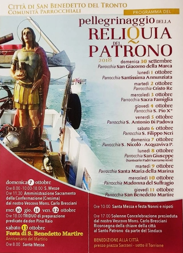 SAN BENEDETTO DEL TRONTO – I festeggiamenti in onore di San Benedetto Martire, patrono della nostra città, sono alle porte e come sempre la comunità cittadina si appresta a vivere con fervore questo momento così importante, tanto sotto l’aspetto religioso quanto sotto l’aspetto civile. Per dodici giorni consecutivi la reliquia del santo sarà esposta in altrettante parrocchie. Si inizierà domenica 30 settembre con la Parrocchia San Giacomo della Marca.