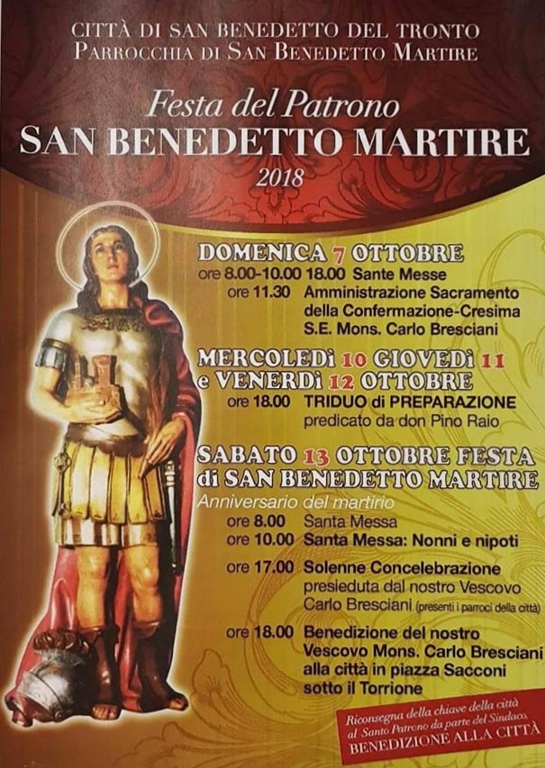 Domenica 7 ottobre presso la chiesa di San Benedetto Martire le messe saranno celebrate alle 8.00, alle 10.00 e alle 18.00, mentre alle 11.30 il vescovo amministrerà il sacramento della Cresima ad alcuni ragazzi della parrocchia. Nei giorni 10, 11 e 12 ottobre alle ore 18.00, sempre presso la Parrocchia San Benedetto Martire, verrà celebrato il triduo in preparazione della festa che sarà predicato da don Pino Raio. Sabato 13, festa del Santo Patrono, le messe saranno celebrate alle 8.00, alle 10.00 (per nonni e nipoti) e alle 17.00. Quest’ultima Santa Messa sarà presieduta dal vescovo diocesano Mons. Carlo Bresciani e concelebrata da tutti i parroci della città. Durante il sacro rito, il Sindaco riconsegnerà le chiavi della città al Santo Patrono. Al termine della funzione, il vescovo Carlo benedirà la città in Piazza Sacconi, sotto al torrione.