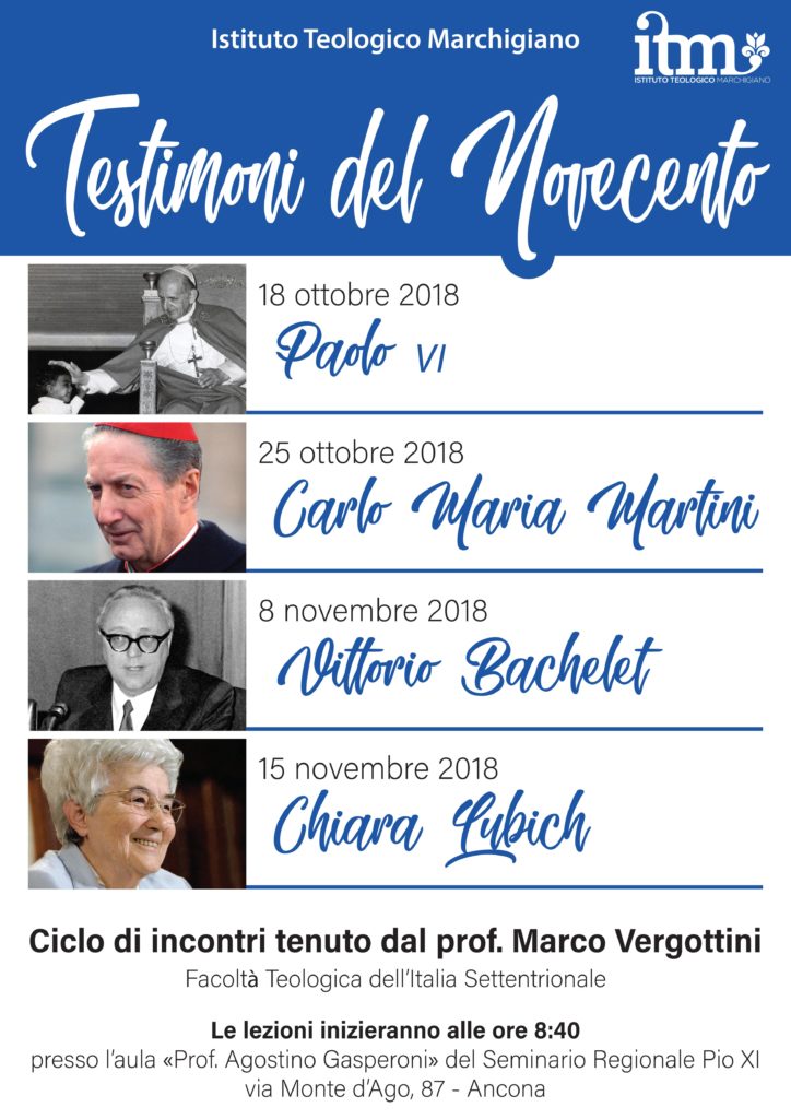 MARCHE – L’Istituto Teologico Marchigiano propone un ciclo di incontri su alcuni testimoni significativi del Novecento. Le lezioni saranno tenute dal prof. Marco Vergottini, docente presso la Facoltà Teologica dell’Italia Settentrionale, e avranno inizio alle ore 8.40 presso l’aula «Agostino Gasperoni» del Seminario regionale Pio XI, via Monte d’Ago, 87 – Ancona.