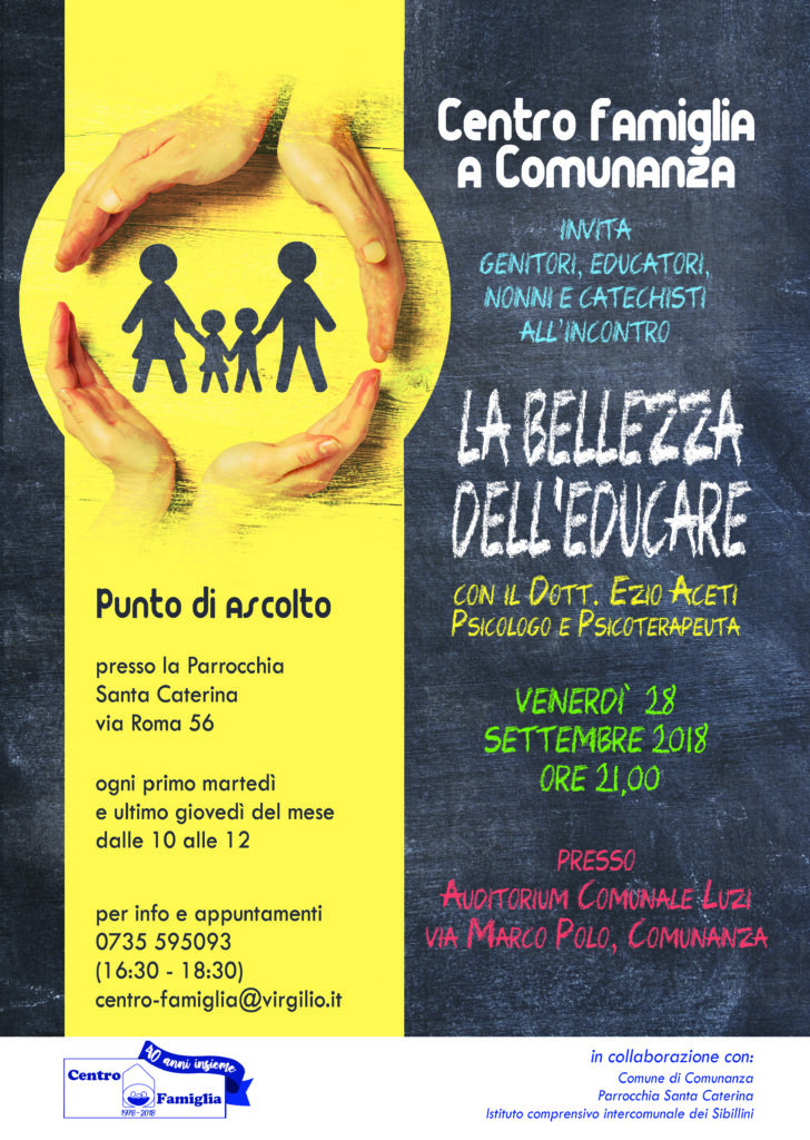 “La bellezza dell’educare” è il titolo dell’incontro rivolto a genitori, educatori, nonni e catechisti. L’appuntamento è per venerdì 18 settembre 2018 alle ore 21 presso l’auditorium comunale Luzi in via Marco Polo.
