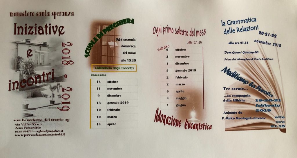 DIOCESI – Anche quest’anno la nostra comunità, presso il Monastero “Santa Speranza” di San Benedetto del Tronto, in via valle dell’oro 2, desidera offrire a quanti siano interessati dei momenti di approfondimento della propria esperienza di fede.
