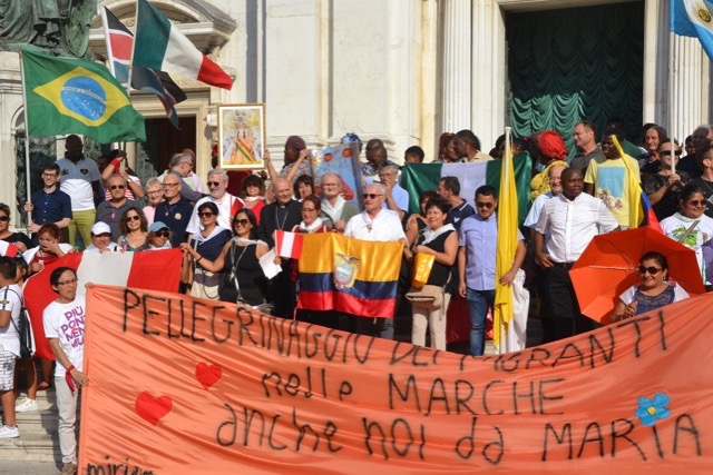 Dietro un popolo variopinto di nigeriani, indiani, ucraini, latinoamericani… vestiti a festa con costumi e bandiere. « Pellegrinaggio marchigiano dei migranti. Anche noi da Maria ! » stava scritto a grandi caratteri sul lunghissimo drappo, che apriva il corteo di circa 300 pellegrini. Portavano con orgoglio la loro fede. Ma anche la loro identità, la loro originalità di uomini e donne venuti da altri orizzonti.