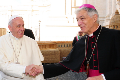 Il 10 giugno 1994 viene nominato vescovo nell’arcidiocesi di Chieti-Vasto e riceve la consacrazione episcopale dalle mani di Silvestrini. L’8 gennaio 2004 la nomina ad arcivescovo di Ancona-Osimo. Nel 2011 ospita il Congresso eucaristico nazionale con la Messa presieduta da Benedetto XVI. Partecipa come membro di nomina pontificia al Sinodo dei vescovi sulla famiglia nel 2014. A 75 anni arriva la porpora: Francesco lo crea cardinale nel Concistoro del 14 febbraio 2015.