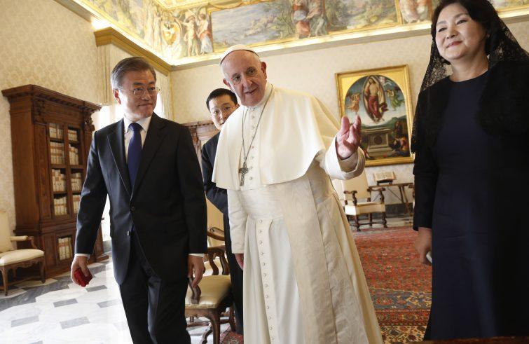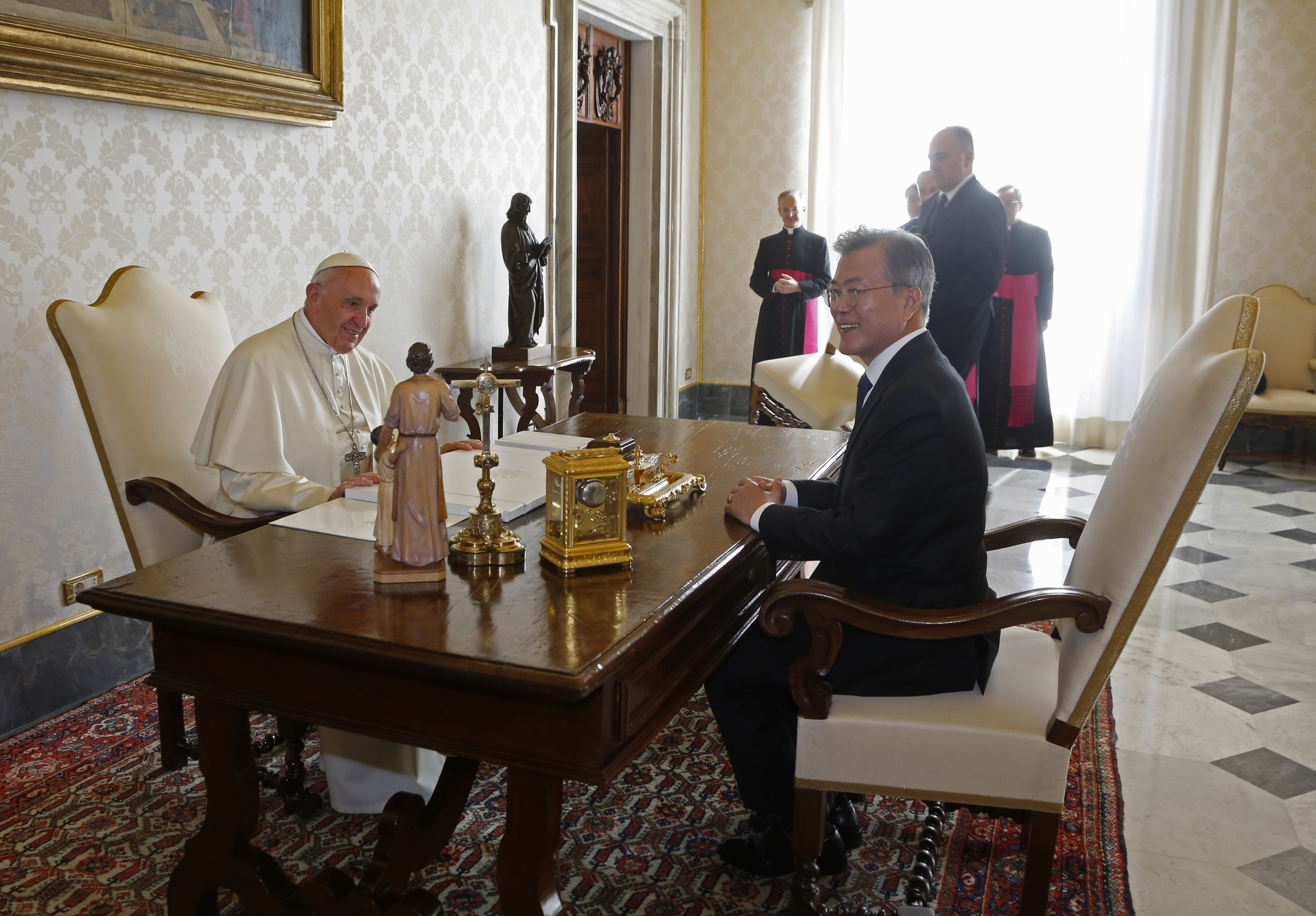 L’incontro a due – hanno raccontato i giornalisti del pool che hanno seguito l’udienza – è durato 35 minuti per un totale di 55 minuti, durante i quali il presidente e il Papa hanno parlato dando visibilità di una grande intesa. Il Papa parlava italiano, il presidente coreano ed erano tradotti da un sacerdote coreano. Quando si sono incontrati il Papa ha detto: “Benvenuto, è un piacere accoglierla”. E il presidente ha risposto: “Vengo come il capo di Stato coreano ma sono anche cattolico, mi chiamo Timoteo di battesimo e per me è un onore incontrarla”. E poi ha aggiunto: “So che lei è molto indaffarato. Grazie per aver trovato tempo per me mentre è in corso il Sinodo”. Poi si sono seduti alla scrivania e il presidente ha ringraziato il Papa per la messa per la pace in Corea che è stata celebrata ieri sera. Il presidente coreano ha portato in dono al Papa una scultura realizzata da un famoso scultore coreano con il volto di Gesù ed una corona di spine e ha detto: “Qui ci sono tutte le sofferenze del popolo coreano”. E poi ha donato anche una statua di marmo della Madonna: “Qui c’è il volto tipico della donna coreana”. Quindi ha detto a Francesco di aver letto tutti i libri citando in particolare il libro “Questa economia uccide”. Il Papa ha donato la medaglia con il ramo d’ulivo, come simbolo di pace, e gli ha consegnato il messaggio scritto per la Giornata della pace in una busta e un grande dipinto di piazza San Pietro del ‘700.