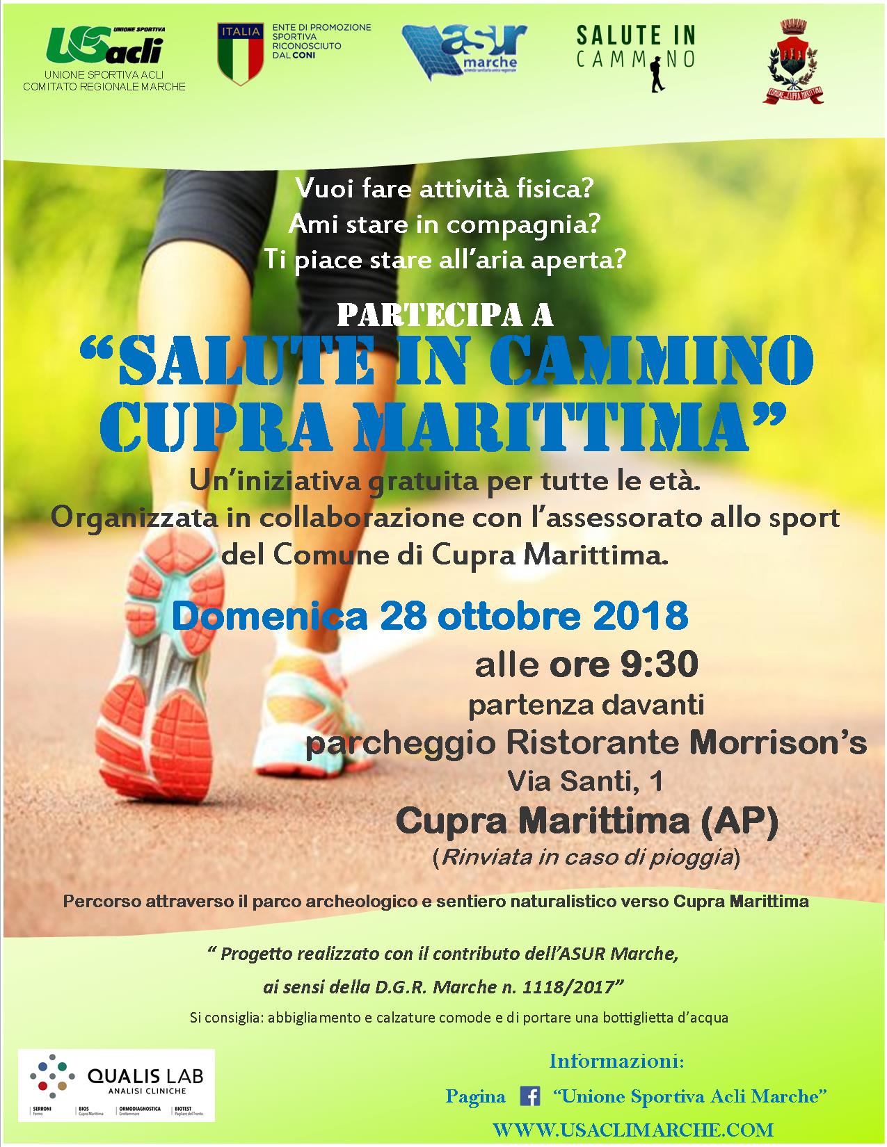 Il programma della prima giornata del progetto prevede un primo appuntamento con “Salute in cammino Cupra Marittima” alle ore 9,30 con partenza davanti al parcheggio del Ristorante Morrison’s in via Santi 1.