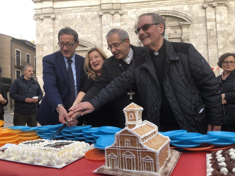 SAN BENEDETTO DEL TRONTO – Una festa di popolo. Non c’è modo migliore per descrivere quello che è accaduto ieri pomeriggio in Piazza Nardone. Giovani e meno giovani, intere famiglie con i loro bambini, si sono ritrovati nella piazza antistante la Cattedrale per festeggiare la riapertura di questo luogo di culto a quasi due anni di distanza dagli eventi sismici che ne hanno causato l’inagibilità e a distanza di una settimana dalla sua effettiva riapertura. Infatti, Domenica scorsa, a causa del maltempo, non era stato possibile svolgere un momento comunitario e di festa, che quindi è slittato alla giornata di sabato 27 ottobre.