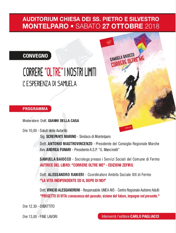 L’editore Carlo Pagliacci, della Casa Editrice Zefiro di Fermo, che ha creduto fortemente nelle eccezionali capacità di Samuela Baiocco, ha voluto e saputo, alla grande, introdurre il pubblico alla lettura del libro “Correre oltre me”. Con grande trasporto ha parlato dei contenuti coinvolgenti, emozionanti, portatori di grandi motivi di riflessione, ma anche divertenti e di grande simpatia. Al termine del suo intervento ha dedicato alcuni attimi, seguiti in un silenzio “assordante”, alla lettura di una pagina del libro.