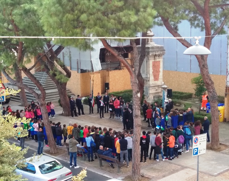 Con la collaborazione dell’Istituto comprensivo “Giacomo Leopardi”, si è svolta la prima parte della mattinata: numerose classi della Primaria hanno incontrato le autorità cittadine e militari e le associazioni combattentistiche davanti al Monumento ai Caduti di via Garibaldi per deporre una corona di alloro e mostrare il lavoro didattico che nei giorni scorsi li ha tenuti impegnati sui temi della pace e del rifiuto di ogni guerra, riscuotendo le lodi di tutti i presenti.