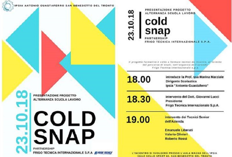 SAN BENEDETTO DEL TRONTO – Dal 12 novembre per tre settimane alcuni alunni selezionati dell’IPSIA “Guastaferro” di San Benedetto del Tronto, vivranno un’esperienza full immersion nella Frigo Tecnica Internazionale: una settimana di lezioni teoriche con i tecnici senior dell’azienda ripana e due settimane fianco a fianco con manutentori e frigoristi esperti. Per illustrare il percorso di alternanza “Cold Snap”, co-progettato da docenti e azienda, si è svolto il 29 ottobre nell’aula magna dell’IPSIA, un incontro molto partecipato tra gli alunni degli indirizzi meccanica ed elettronica, il presidente della Frigo Tecnica Internazionale, Giovanni Lucci e due dei suoi ingegneri.