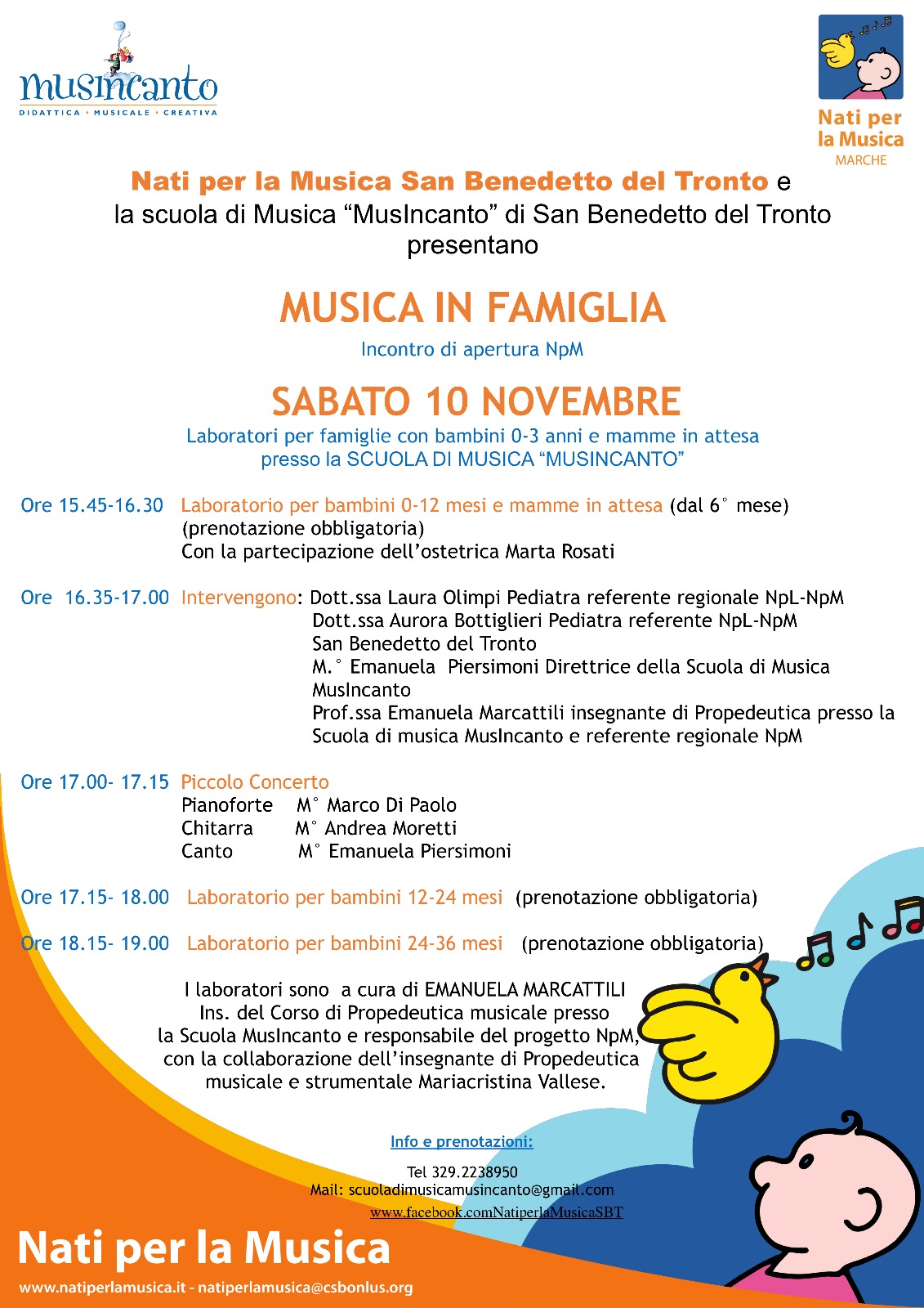SAN BENEDETTO DEL TRONTO – Sabato 10 novembre, nel pomeriggio, presso la Scuola di Musica Musincanto, (via Manara 134, San Benedetto del Tronto) riprenderanno i laboratori di “ Musica in Famiglia” con il progetto Nati per la Musica. Il pomeriggio, alle ore 15.45 ci sarà il primo incontro per bambini da 0 a 12 mesi e mamme in attesa (dal 6° mese) con prenotazione obbligatoria. A seguire un breve intervento delle pediatre Referenti Nati per la Musica e Nati per Leggere Dott.sse Laura Olimpi e Aurora Bottiglieri che esporranno le evidenze scientifiche e i benefici della musica sul bambino. A fare gli onori di casa, la direttrice della scuola M° Emanuela Piersimoni. Non mancherà un “Piccolo Concerto”, sempre particolarmente apprezzato da grandi e piccini, donato dai Maestri della Scuola MusIncanto : Marco Di Paolo (pianoforte), Andrea Moretti (chitarra), Emanuela Piersimoni (canto).