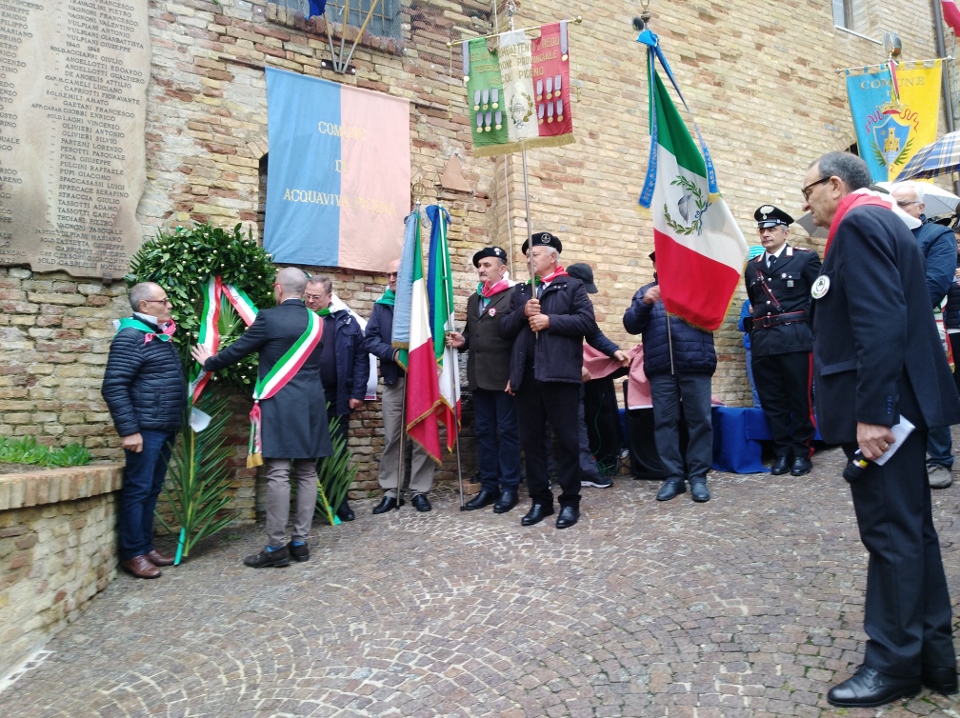 Il Vangelo di oggi poi ci ricorda che adoriamo tante cose materiali, tante cose che appartengono a questo mondo, quando invece l’unico da adorare è solo Dio. La salute, la famiglia sono importanti, ma non vanno adorate, solo il Signore va adorato. Gesù ci ricorda poi un’altra cosa, che dobbiamo imparare ad ascoltare, abbiamo due orecchie e una bocca perché dobbiamo ascoltare il doppio di quello che diciamo e invece succede sempre il contrario. Stiamo lontano dall’idolatria, la serenità e il bene vengono solo dal Signore”. Dopo la santa Messa è stata deposta una corona in onore dei caduti e i bambini della scuola di Acquaviva dopo aver letto i nomi, hanno riportato alcune loro riflessioni. Il sindaco Rosetti ha detto: “ Tanti giovani hanno combattuto per la Patria, si sono ritrovati tutti insieme per un unico fine, accettato o meno, hanno formato un unico popolo e forse in quel momento non tutti se ne saranno accorti, ma da ogni parte d’Italia i giovani hanno formato un unico esercito, l’esercito italiano, c’è stata coesione. Io voglio ricordare ai più giovani il sacrificio al quale tanti adolescenti sono stati chiamati e che hanno portato all’Unità Nazionale. La Costituzione Italiana, cari ragazzi, ripudia la guerra come strumento di risoluzione delle controversie; privilegia la pace, il rispetto dei diritti umani e delle minoranze. Associandomi alle parole di Sua Eccellenza Monsignor Gervasio, ricordatevi che la pace è la prima via da perseguire”. Immancabile il vento come tutti gli anni, sia che spenda il sole sia che cada la pioggia, una leggera brezza si alza sempre durante la deposizione della corona d’allora e mentre vengono letti i nomi dei soldati acquavivani caduti al fronte, come a voler sottolineare il commovente momento.