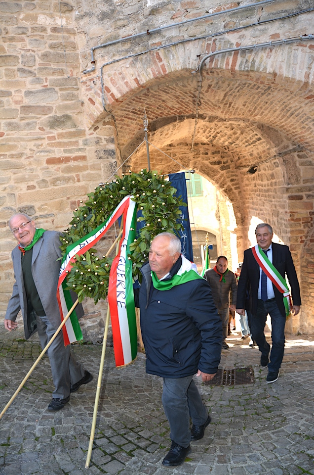 Si sono dati appuntamento davanti al Palazzo Comunale gli organizzatori che, in fare solenne con la partecipazione del Sindaco accompagnato dalla bandiera e dallo stemma di Montelparo, si sono diretti, con la corona d’alloro a fare da guida, verso il monumento ai caduti di tutte le guerre.