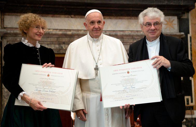 “Non è la prima volta – perché già la prof.ssa Anne-Marie Pelletier lo ha ricevuto –, ma è molto importante che venga riconosciuto sempre di più l’apporto femminile nel campo della ricerca teologica scientifica e dell’insegnamento della teologia, a lungo considerati territori quasi esclusivi del clero”, il tributo di Francesco, secondo il quale “è necessario che tale apporto venga incoraggiato e trovi spazio più ampio, coerentemente con il crescere della presenza femminile nei diversi campi di responsabilità della vita della Chiesa, in particolare, e non solo nel campo culturale”. “Da quando Paolo VI proclamò Teresa d’Avila e Caterina da Siena dottori della Chiesa non è permesso più alcun dubbio sul fatto che le donne possono raggiungere le vette più alte nell’intelligenza della fede”, ha affermato il Papa: “Anche Giovanni Paolo II e Benedetto XVI lo hanno confermato, inserendo nella serie dei dottori i nomi di altre donne, Santa Teresa di Lisieux e Ildegarda di Bingen”. “Oltre alla teologia, dallo scorso anno i Premi Ratzinger sono stati opportunamente conferiti anche nel campo delle arti cristianamente ispirate”, ha sottolineato Francesco congratulandosi con il secondo premiato di quest’anno, l’architetto Mario Botta: “In tutta la storia della Chiesa gli edifici sacri sono stati richiamo concreto a Dio e alle dimensioni dello spirito ovunque l’annuncio cristiano si è diffuso nel mondo; hanno espresso la fede della comunità credente, l’hanno accolta contribuendo a dar forma e ispirazione alla sua preghiera. L’impegno dell’architetto creatore di spazio sacro nella città degli uomini è quindi di valore altissimo, e va riconosciuto e incoraggiato dalla Chiesa, in particolare quando si rischia l’oblio della dimensione spirituale e la disumanizzazione degli spazi urbani”. “Sullo sfondo e nel contesto dei grandi problemi del nostro tempo, la teologia e l’arte devono dunque continuare ad essere animate ed elevate dalla potenza dello Spirito, sorgente di forza, di gioia e di speranza”, l’auspicio del Papa, che ha concluso il suo discorso ricordando “le parole con cui il nostro Papa emerito ci invitava alla speranza evocando l’elevazione spirituale di un grande teologo e santo particolarmente caro a lui e ben conosciuto dalla nostra premiata, la professoressa Schlosser. In occasione della sua visita a Bagnoregio, patria di san Bonaventura, Benedetto XVI così si esprimeva: ‘Una bella immagine della speranza la troviamo in una delle sue prediche di Avvento dove paragona il movimento della speranza al volo dell’uccello, che dispiega le ali nel modo più ampio possibile, e per muoverle impiega tutte le sue forze. Rende, in un certo senso, tutto se stesso movimento per andare in alto e volare. Sperare è volare, dice san Bonaventura. Ma la speranza esige che tutte le nostre membra si facciano movimento e si proiettino verso la vera altezza del nostro essere, verso le promesse di Dio. Chi spera – egli afferma – ‘deve alzare il capo, rivolgendo verso l’alto i suoi pensieri, verso l’altezza della nostra esistenza, cioè verso Dio’”. “Ringrazio i teologi e gli architetti che ci aiutano ad alzare il capo e a rivolgere i nostri pensieri verso Dio”, l’omaggio finale: “Auguri a tutti voi per il vostro nobile lavoro, perché sia sempre indirizzato a questo fine”.