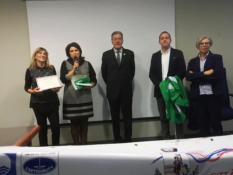 SAN BENEDETTO DEL TRONTO – Si è svolta giovedì 22 novembre, presso l’Auditorium Comunale “G. Tebaldini”, la cerimonia di consegna della bandiera verde Eco – Schools ai tre Istituti scolastici comprensivi cittadini alla presenza dei rispettivi dirigenti e di una rappresentativa di alunni e docenti. Accolto dall’assessore all’ambiente Andrea Traini, il referente regionale FEE Italia (il soggetto che assegna i vessilli) prof. Camillo Nardini.