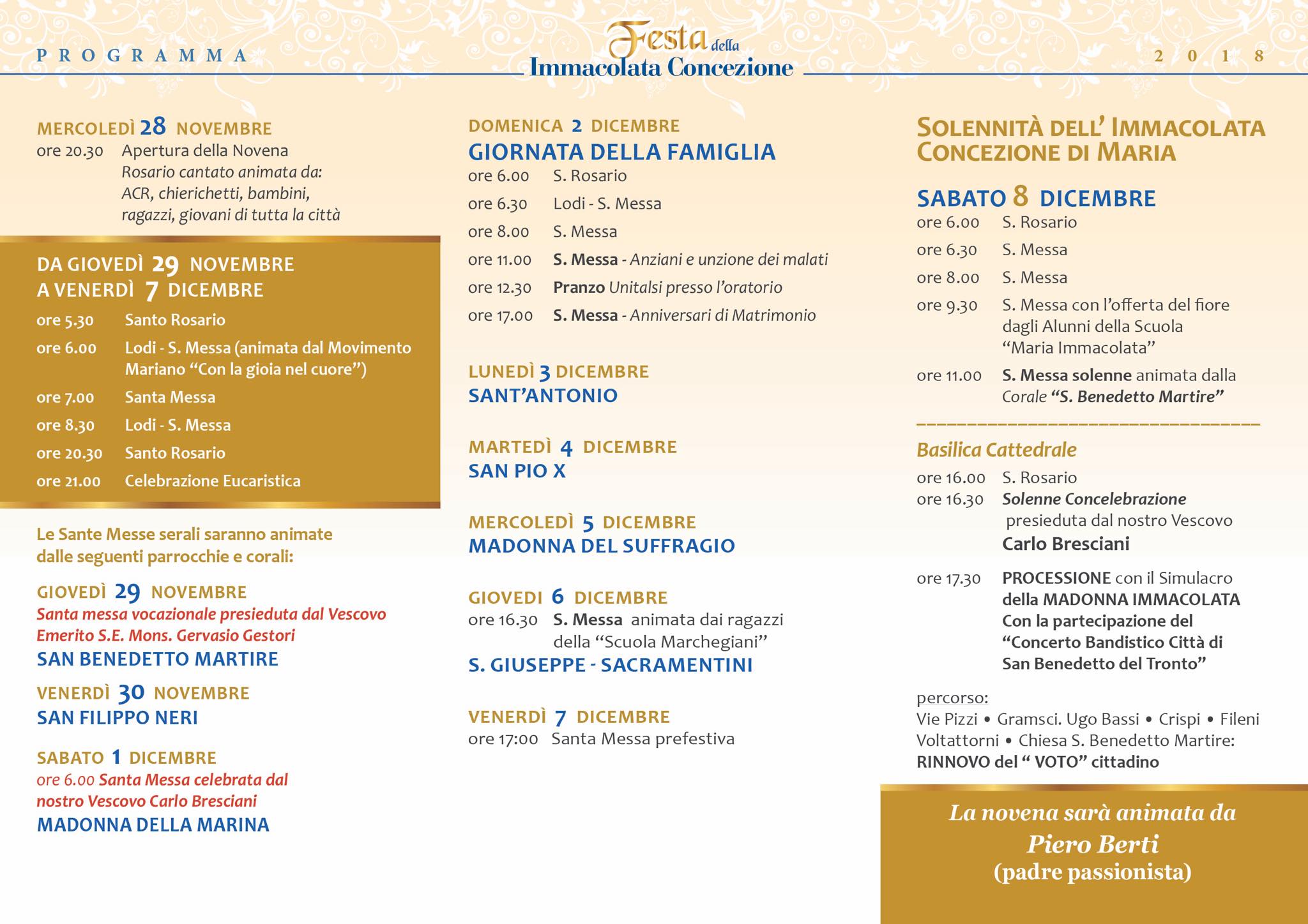 SAN BENEDETTO DEL TRONTO – Mercoledì 28 novembre è iniziata presso la parrocchia di San Benedetto Martire la Novena all’Immacolata Concezione che rappresenta per i sambenedettesi un momento di grande spiritualità. La ricorrenza si tiene in memoria del voto cittadino fatto nel 1855 per debellare il colera che stava mietendo molte vittime a San Benedetto.