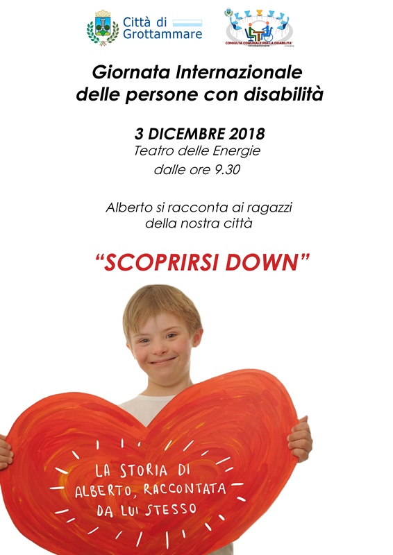 GROTTAMMARE – Per la Giornata internazionale delle persone con disabilità, 3 dicembre, l’assessorato all’Inclusione sociale ha organizzato per i bambini delle scuole la presentazione del libro “Scoprirsi down”. L’iniziativa si terrà nel giorno della ricorrenza, lunedì 3 dicembre, e vista la risposta positiva della Scuola, l’incontro è stato diviso in due momenti, in base alle fasce di età: i bambini che frequentano la scuola Primaria – classi terze, quarte e quinte di tutti i plessi – si incontreranno in teatro alle 9.30; alle 10.45, arriveranno i bambini di alcune quinte della Primaria e i ragazzi delle classi Secondarie.